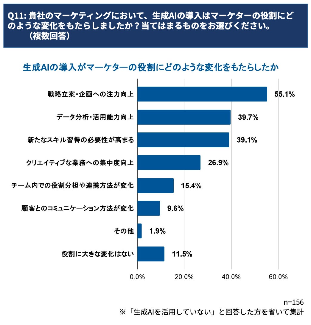 過半数(55.1%)のマーケターが、AI導入によって「戦略立案・企画への注力向上」が起きたと回答しています 。このデータは、AIが単なる作業ツールではなく、マーケターをより上流の業務へと引き上げるための強力なパートナーとなり得ることを示唆しています。