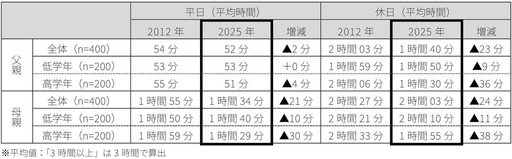 休日はさらに減少幅が大きく、父親が1時間40分(▲23分)、母親が2時間3分(▲24分)と、いずれも20分以上短くなっています。特に高学年の子どもとは、父親が1時間30分(▲36分)、母親が1時間55分(▲38分)と、大きく減少していることが分かります。