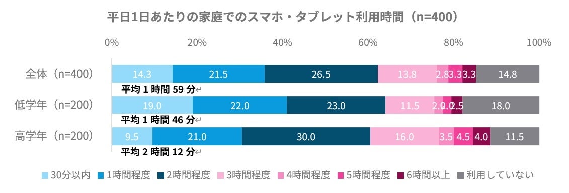子どものスマホ・タブレット利用は平日で平均「約2時間」、高学年ほど長時間に