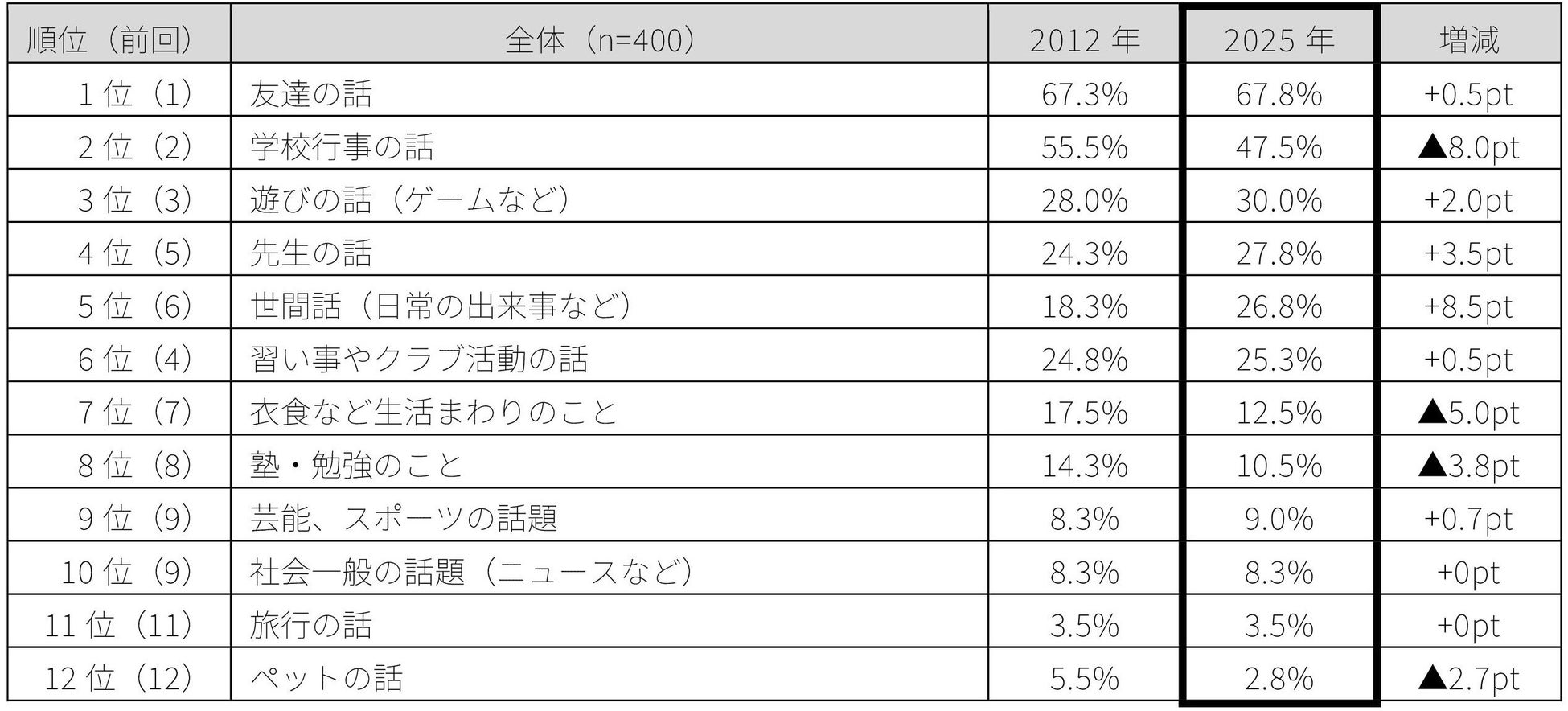 その中でも変化が見られたのは、「学校行事の話」が8.0ポイント減少した一方で、「世間話(日常の出来事など)」が8.5ポイント増加した点です。イベント性のあるトピックから、その日にあった出来事など、より日常的で気軽なテーマへと広がってきているようです。