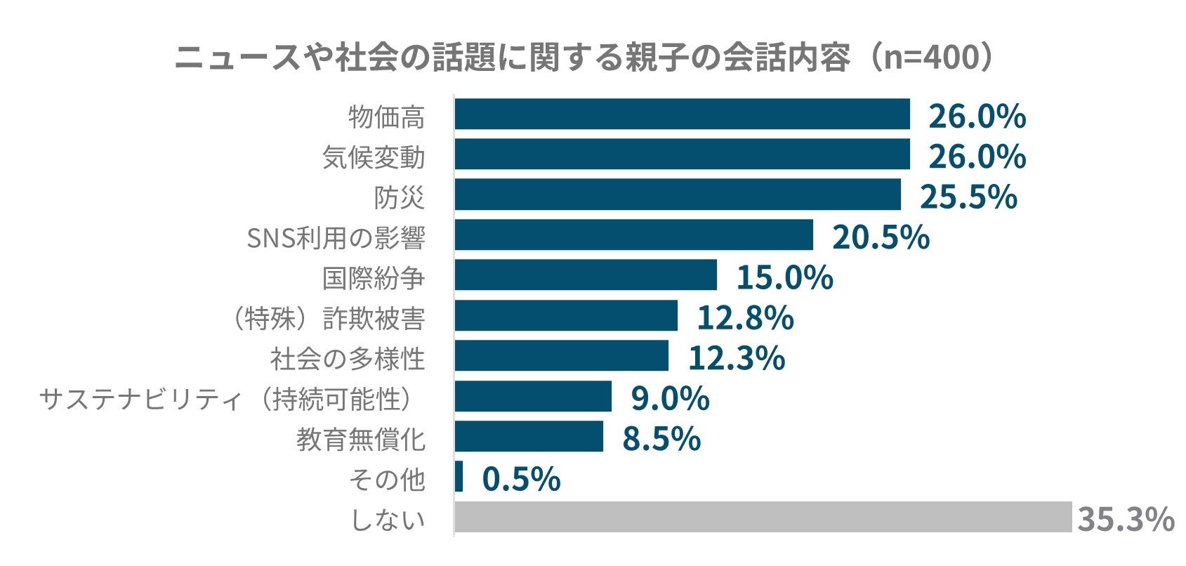 最近のニュースや社会の話題について、親子で会話することがあるかを尋ねたころ、6割以上(64.7%)の家庭で、日常的に社会的なテーマが会話に取り入れられていることが分かりました。なかでも話題に上がりやすいのは、「物価高について」(26.0%)、「気候変動について」(26.0%)、「防災について」(25.5%)といった、生活に直結するテーマです。また、「SNS利用の影響について」(20.5%)も比較的高く、家庭内で現代ならではの社会課題について考える機会があることがうかがえます。