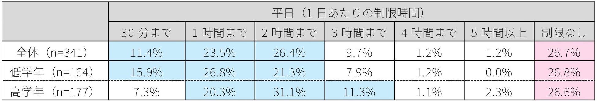 一方、「制限なし」と回答した家庭は全体の26.7%を占め、低学年(26.8%)と高学年(26.6%)ともにほぼ同水準です。子どもに自己管理を任せる、あるいは意図的にルールを設けていない家庭も一定数あるようです。