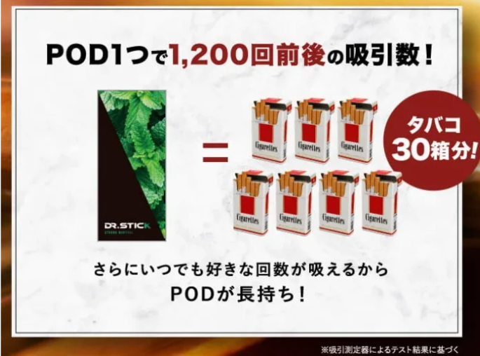 スタイリッシュな見た目だけではなく、POD1個あたりの吸引回数が1200回で、なんとPOD1箱でタバコ約30箱分※の吸引回数を誇ります。