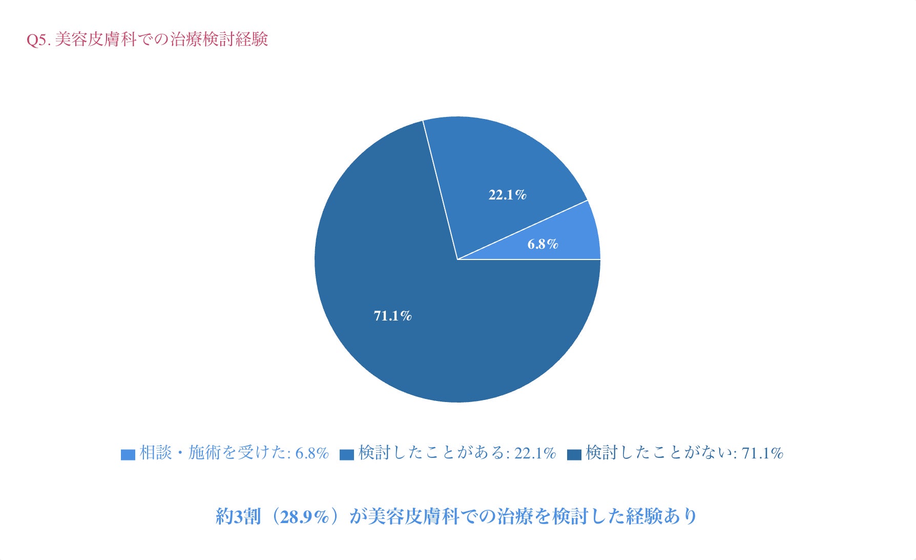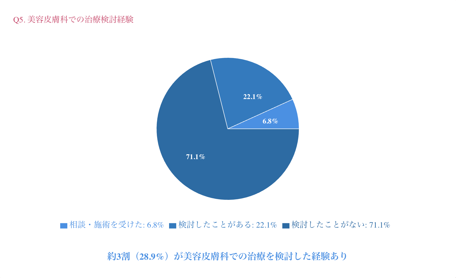 その結果、「検討したことがある」が22.1%、「実際に相談・施術を受けた」が**6.8%**で、合わせて約3割の方が医療的なアプローチを検討した経験があることが分かりました。