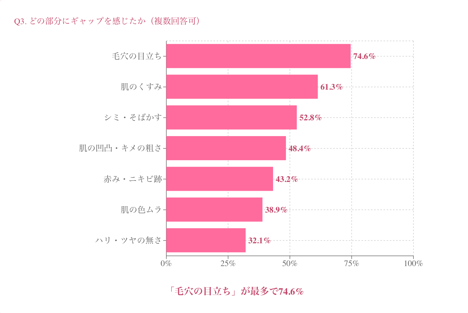 その結果、最も多かったのは「毛穴の目立ち」で74.6%、次いで「肌のくすみ」(61.3%)、「シミ・そばかす」(52.8%)という結果になりました。