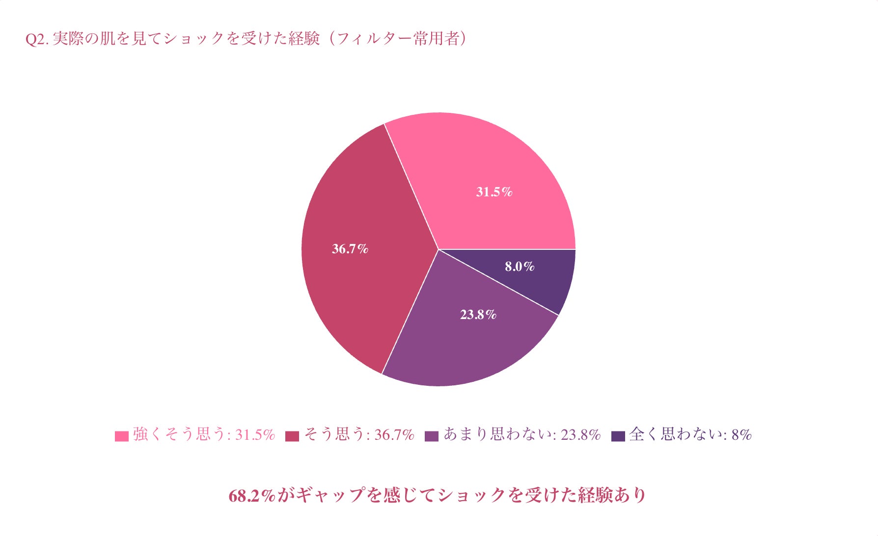 その結果、**68.2%**の方が「ギャップを感じてショックを受けた」と回答し、フィルター常用者の約7割が"加工肌"と"リアル肌"の違いに衝撃を受けた経験があることが明らかになりました。