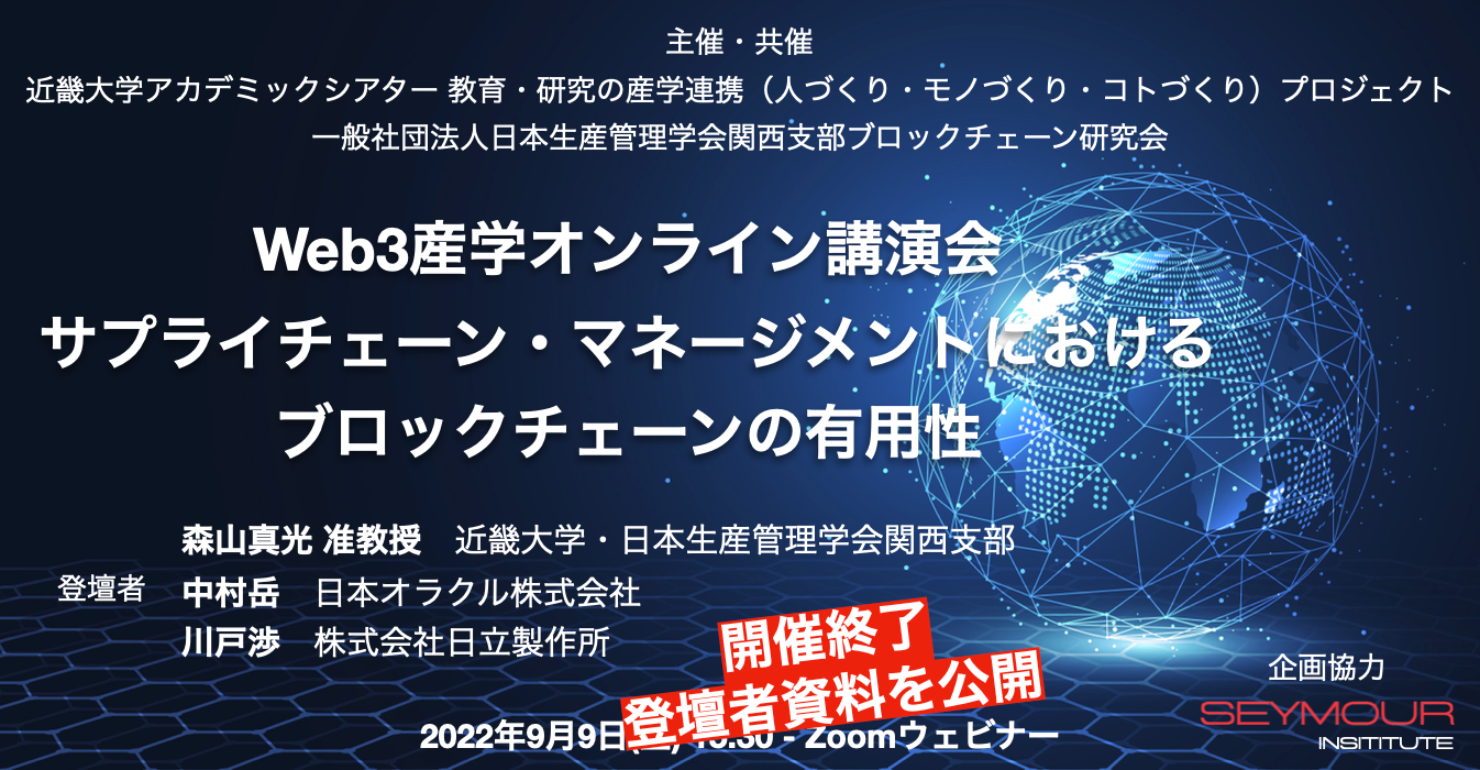 テクノロジーにおける産学連携活動を行う アカデミック シンクタンク SEYMOUR INSTITUTE 株式会社(本社:東京都渋谷区広尾、代表:太田真)は、日本生産管理学会関西支部ブロックチェーン研究会と近畿大学アカデミックシアター教育・研究の産学連携(人づくり・モノづくり・コトづくり)プロジェクトが共催する生産管理におけるブロックチェーンとその有用性についての情報を共有する講演会を開催します。企業登壇では日本オラクル株式会社と株式会社日立製作所のブロックチェーン事業担当者が活用事例や概念実証の取り組みについて話します(2022年9月9日開催終了)。