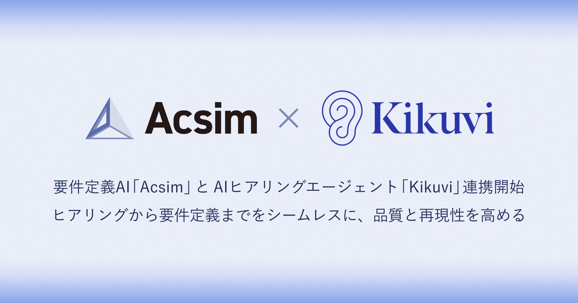 要件定義AI「Acsim」とAIヒアリングエージェント「Kikuvi」がサービス連携を開始。要件定義の起点となるヒアリングの属人化を解消