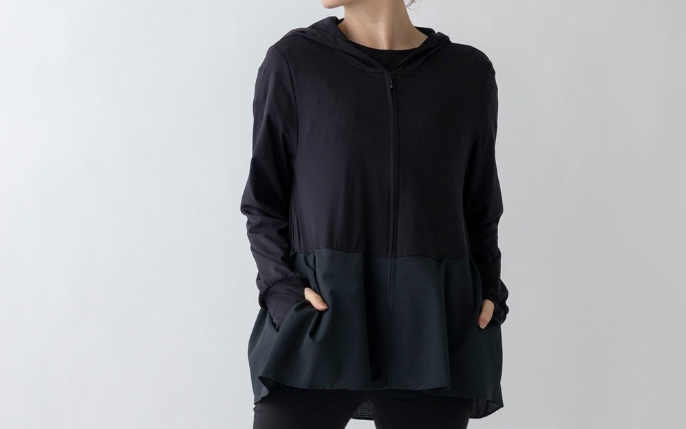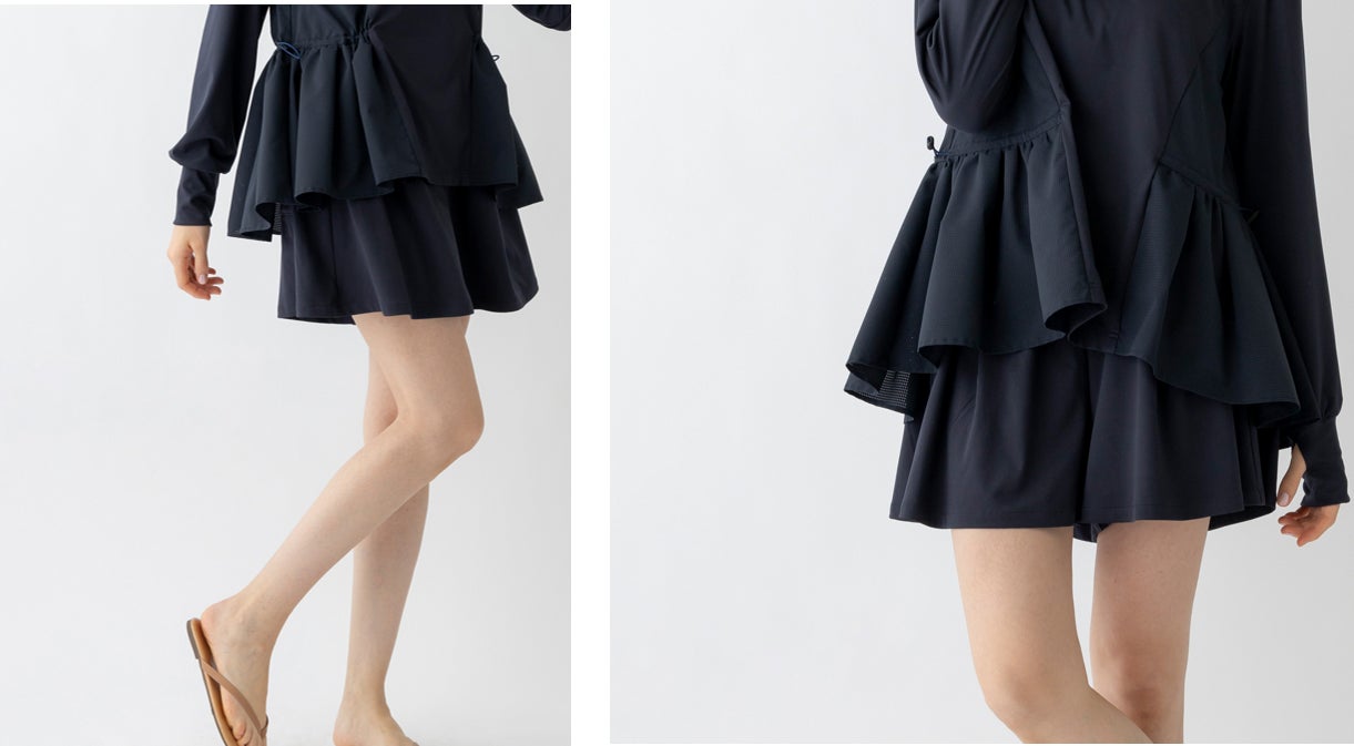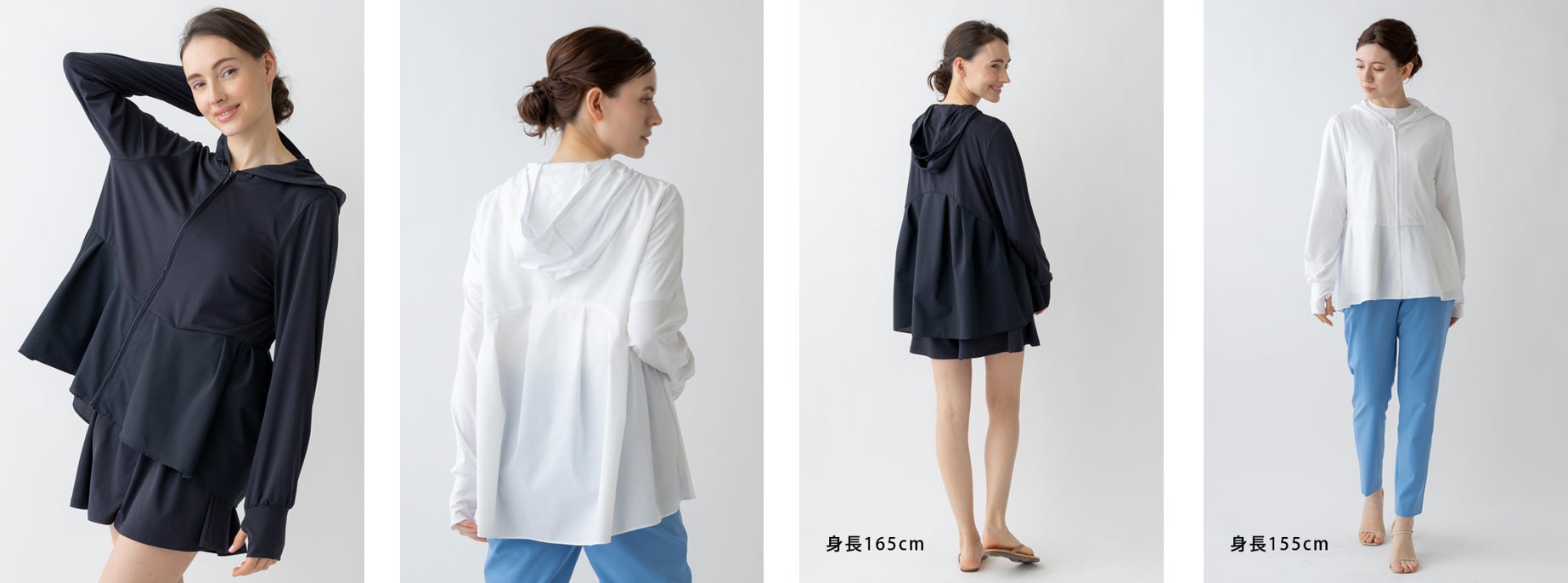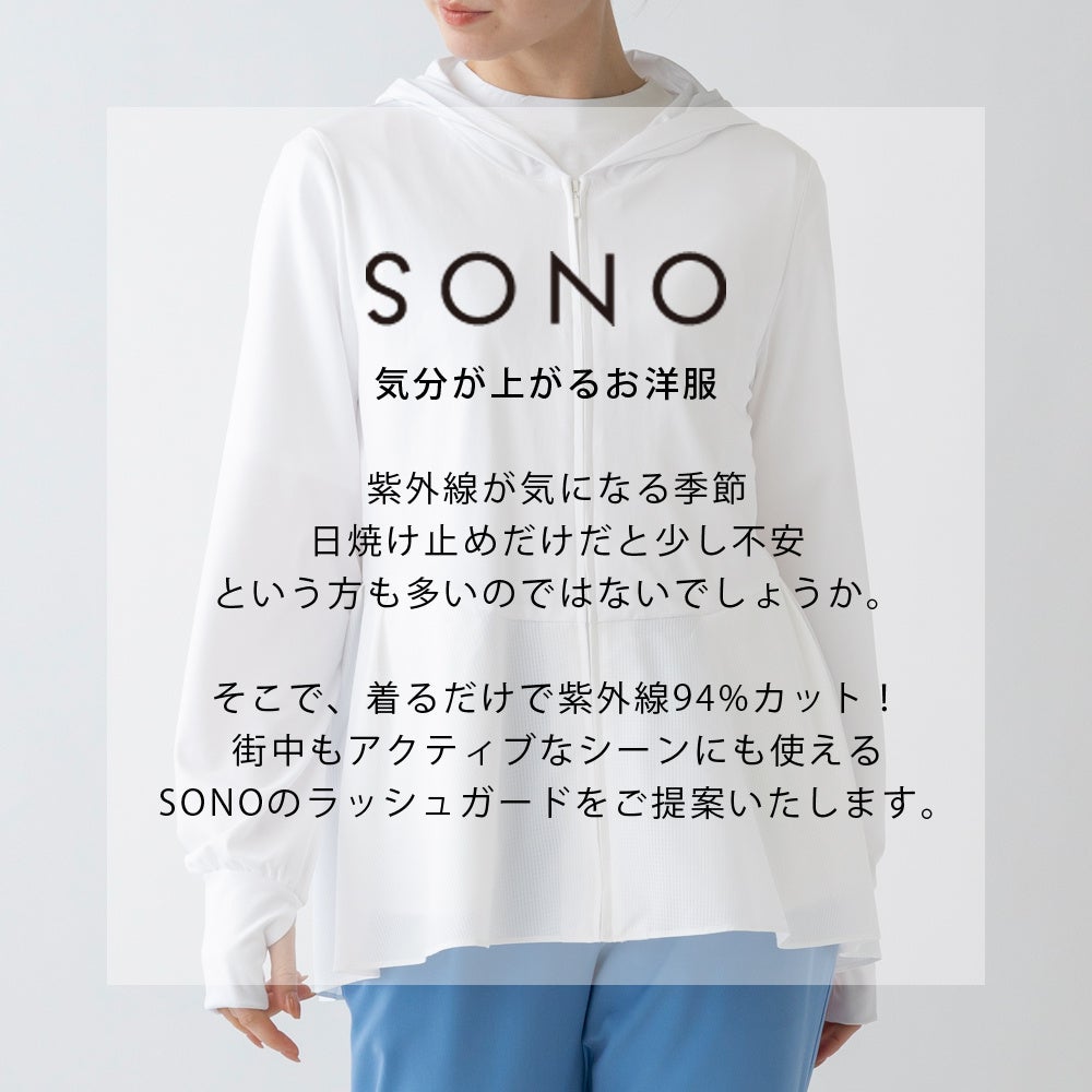 軽やかな着心地ながらしっかり紫外線対策できる人気のフーディータイプです。SONOらしい上品に広がるフレアが程良い甘さでお洒落。高めの位置で切り替えることで、スタイルアップも叶いました。
