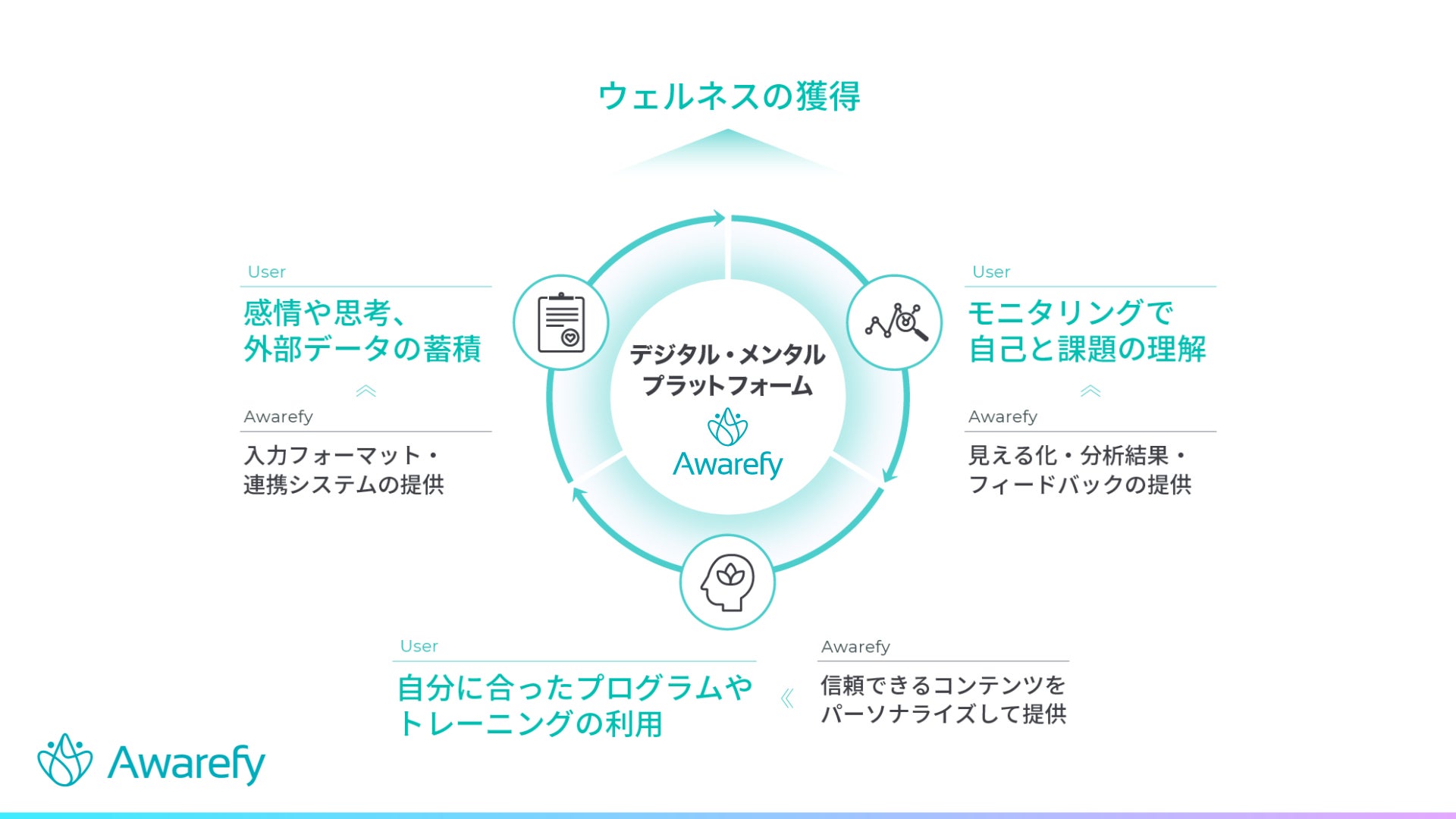Awarefy は、「心をケアするスキルが身に付く」をコンセプトとした、認知行動療法(※1)に手軽に取り組めるスマートフォンアプリです。日々のコンディションや感情を記録したり、マインドフルネス瞑想に取り組んだりすることで、自分に必要な心のケアをトレーニングできます。