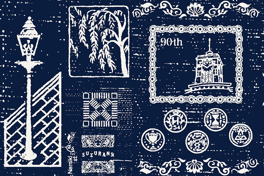 銀座と言えば、お馴染みの柳やガス灯、すきやばし交差点をふんだんに取り入れ、沖縄らしいシーサーが散りばめられているユーモアで涼しげな1着。