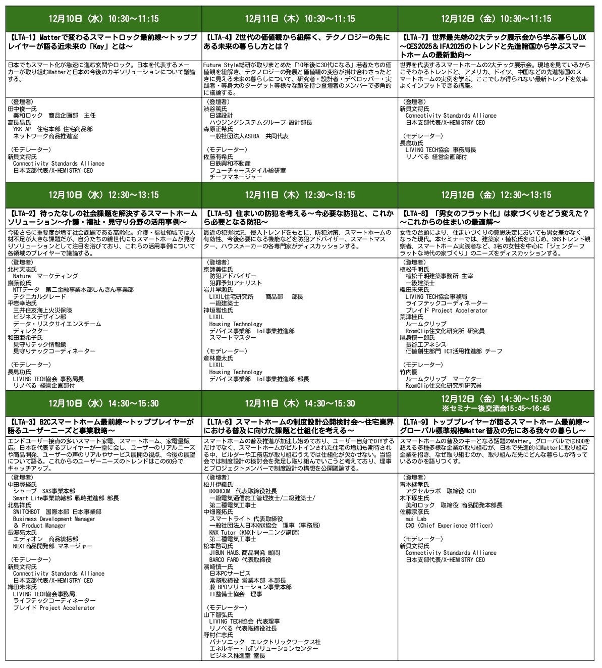 今回は、「業界トレンド」、「最新事例」、「社会課題の解決」、「ユーザー視点、」「スマートホームのグローバル共通規格『Matter』」等、バリエーション豊かな9セッションで、B2Cスマートホームのプレイヤーや、ユーザー視点でのゲストスピーカーを招きながら、皆様と一緒に今後の住宅業界とテクノロジーについて考えるセッションを行います。最終日の最終セッション(LTA-9)後には、どなたでもご参加いただける交流会(軽飲食あり)も予定しておりますので、奮ってご参加ください。