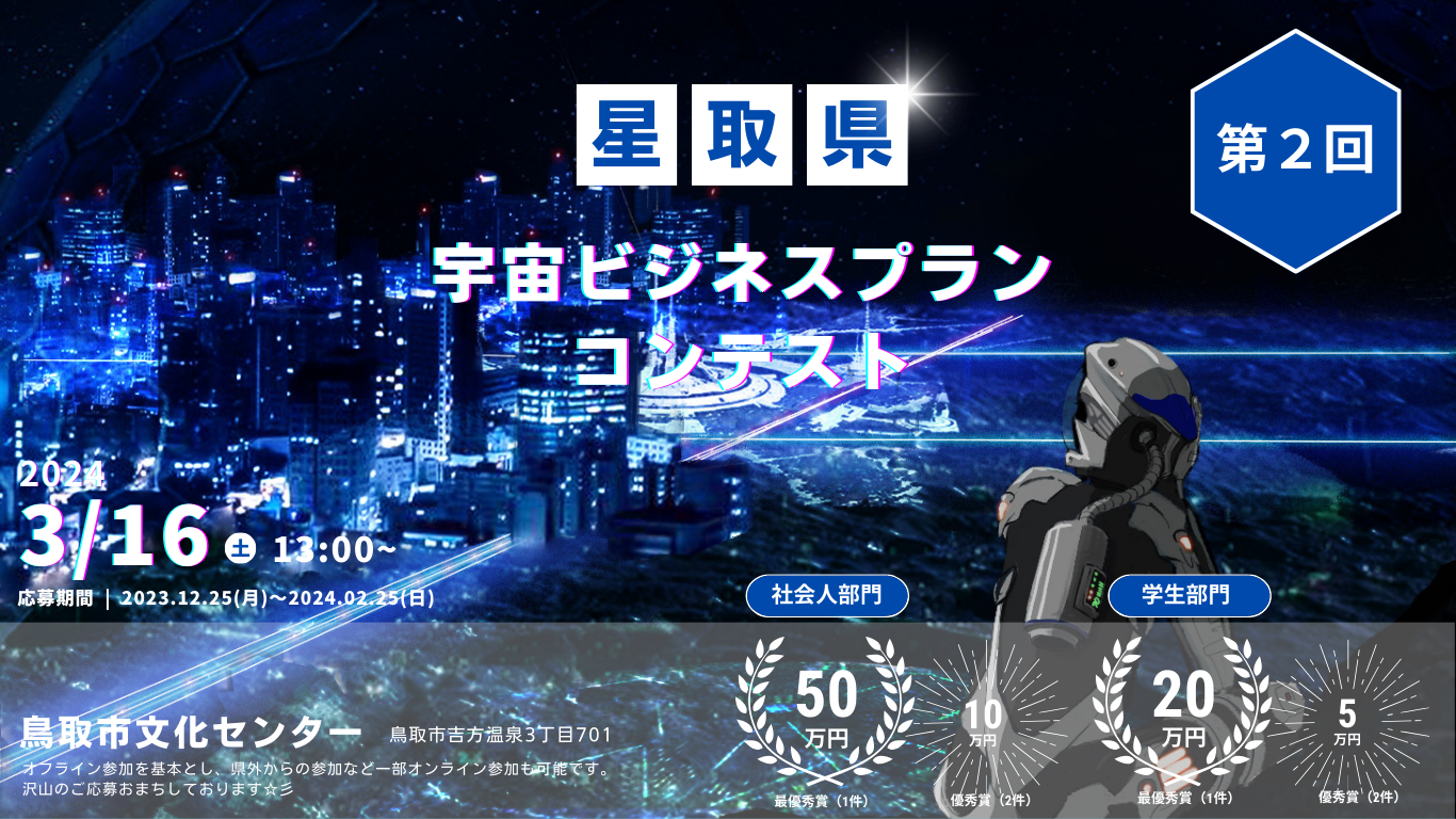 日本国内外で宇宙産業が大きく成長することが見込まれる中、美しい星空を活用した地域振興に取り組む「星取県」こと鳥取県は、地域の将来を支える産業の一つとして、「鳥取県から宇宙産業を創出する」という取組を進めています。この一環として、鳥取県内で宇宙関連のビジネスにチャレンジする事業者・起業家を増やすため、鳥取県主催の「第2回星取県宇宙ビジネスプランコンテスト」を実施します。