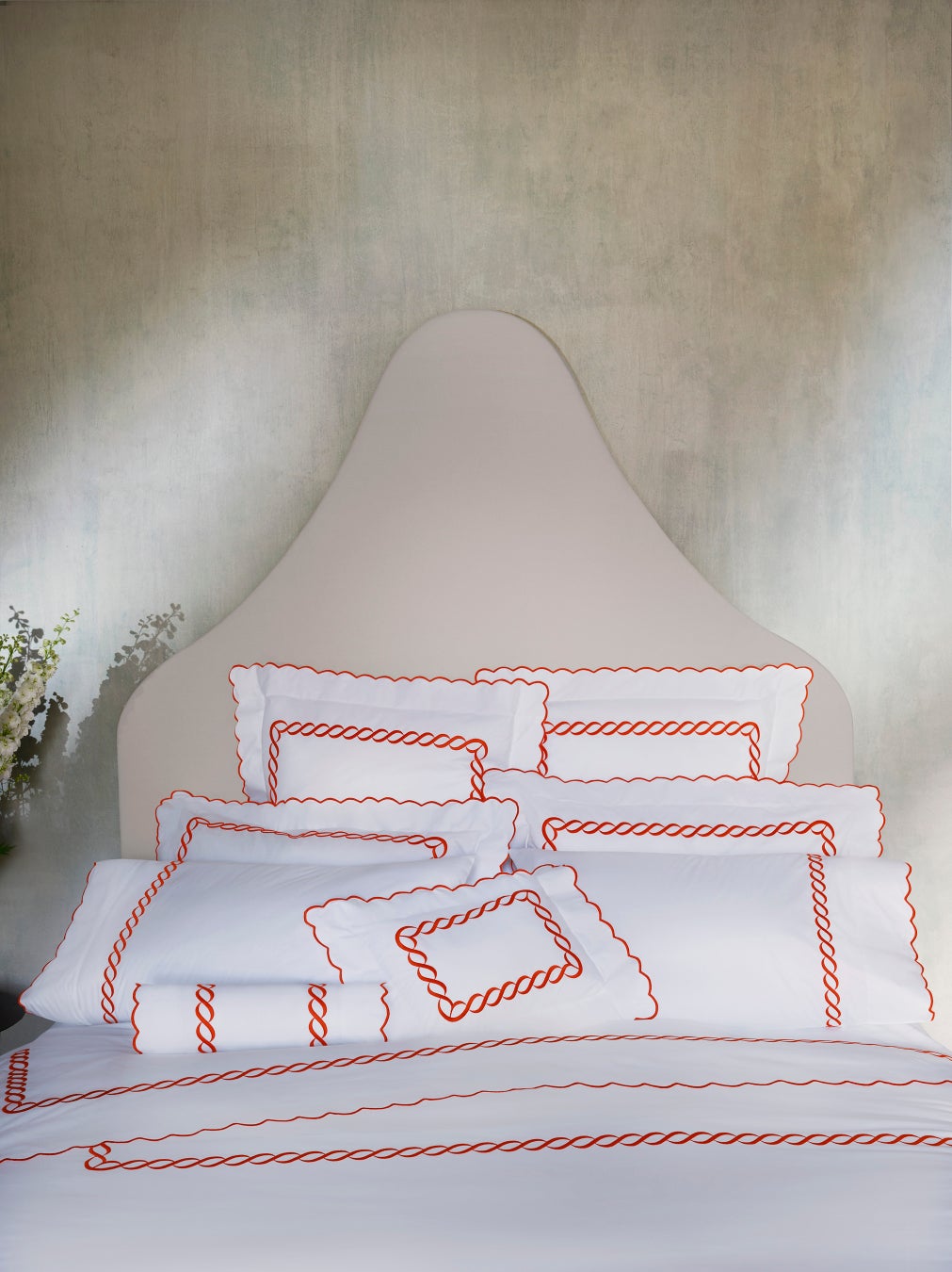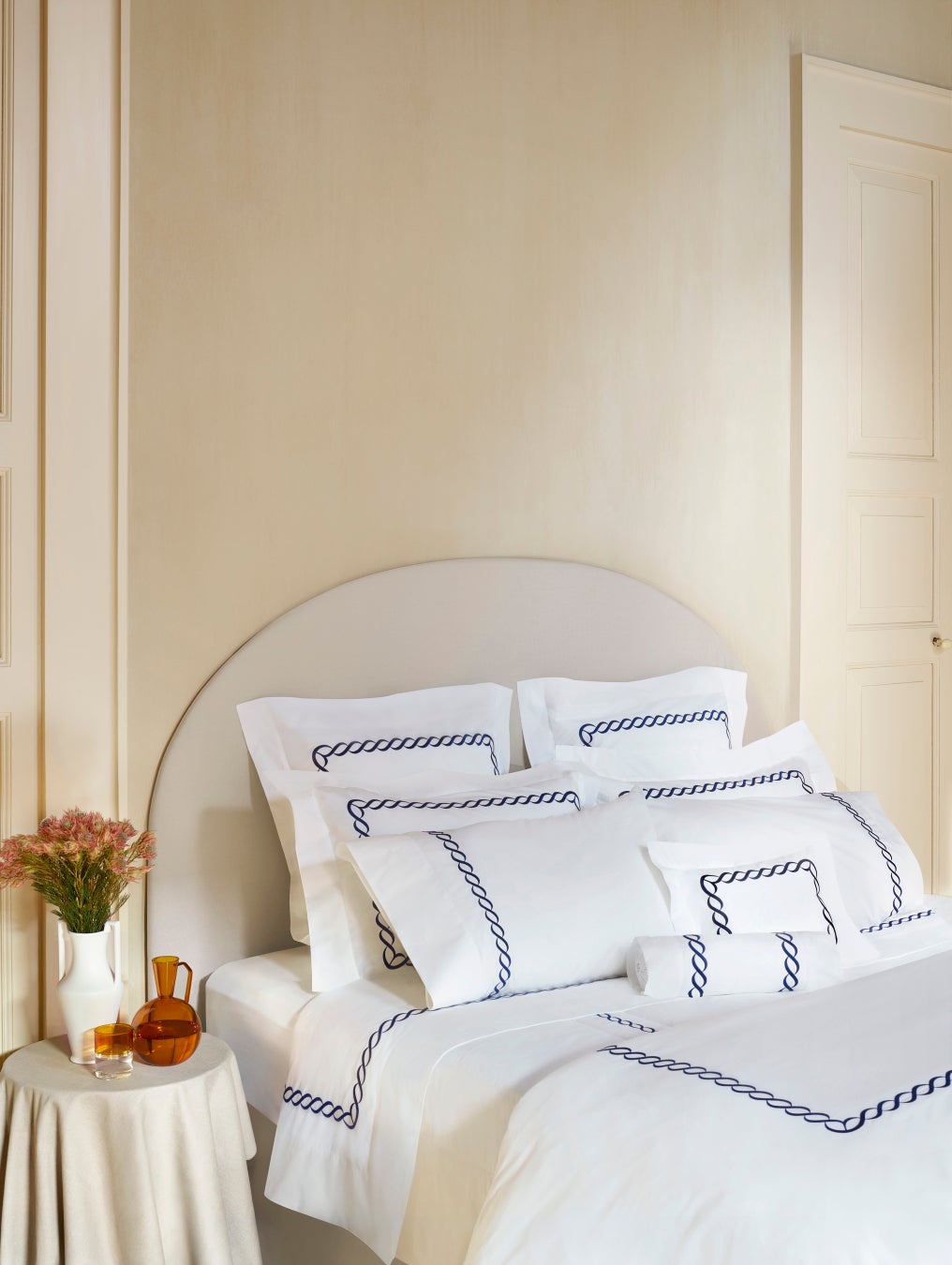 Treccia Collection:フィレンツェ建築の、螺旋状のレリーフで飾られた柱からインスピレーションを得たコレクション。エジプト綿を使用したパーケール生地に、熟練の職人が鮮やかなカラーリングの刺繍を施します。刺繍と同じカラーの美しいスカラップエッジが、上品さとあたたかみをもたらしています。