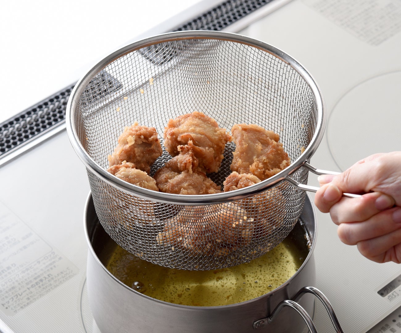 ストレーナーは蒸しかごとして蒸し料理に使う他にも、茹で物や揚げ物をする際に使えば食材を一気に引き上げられ加熱ムラを防ぐなど、様々な使い方ができます。