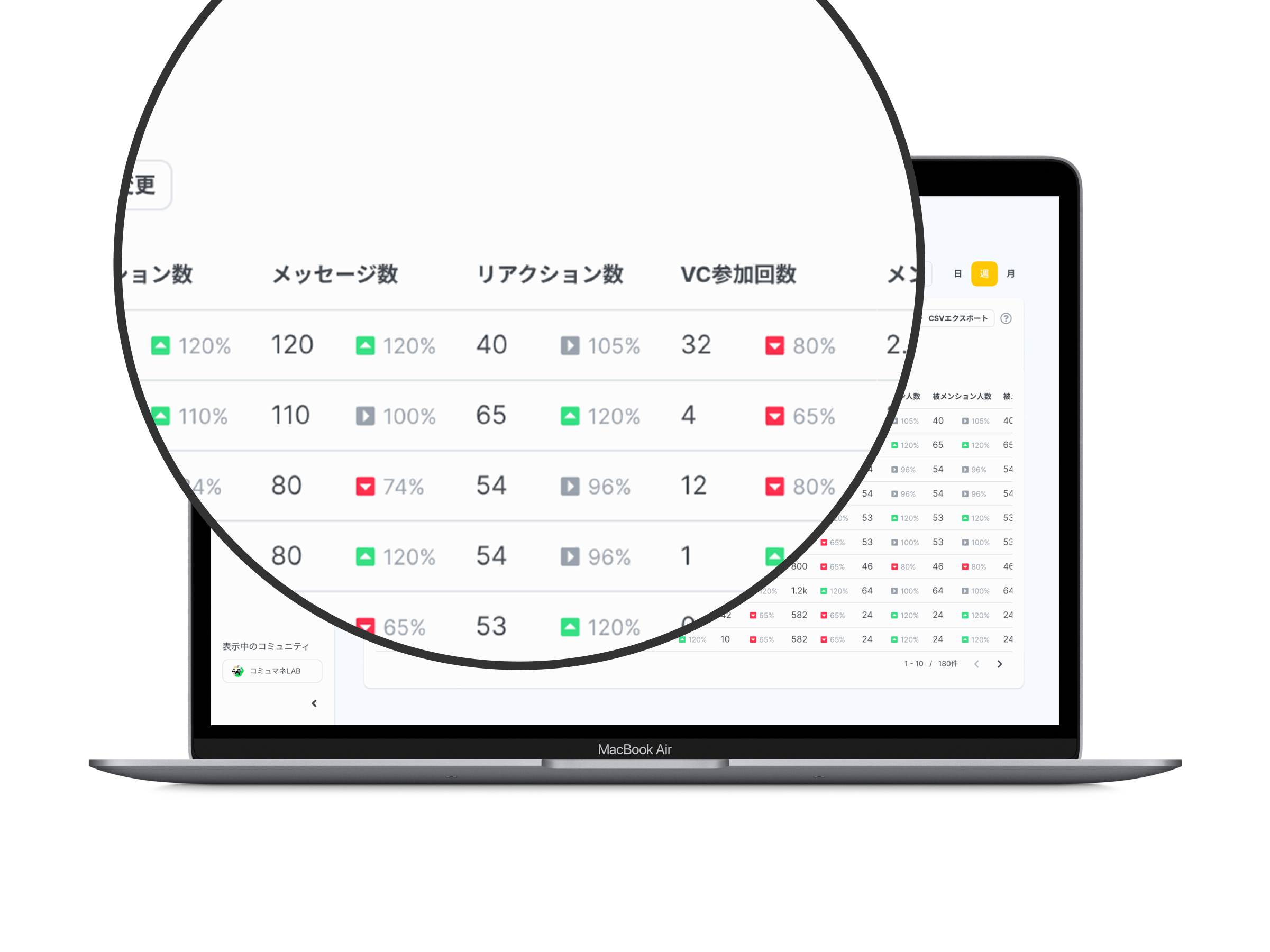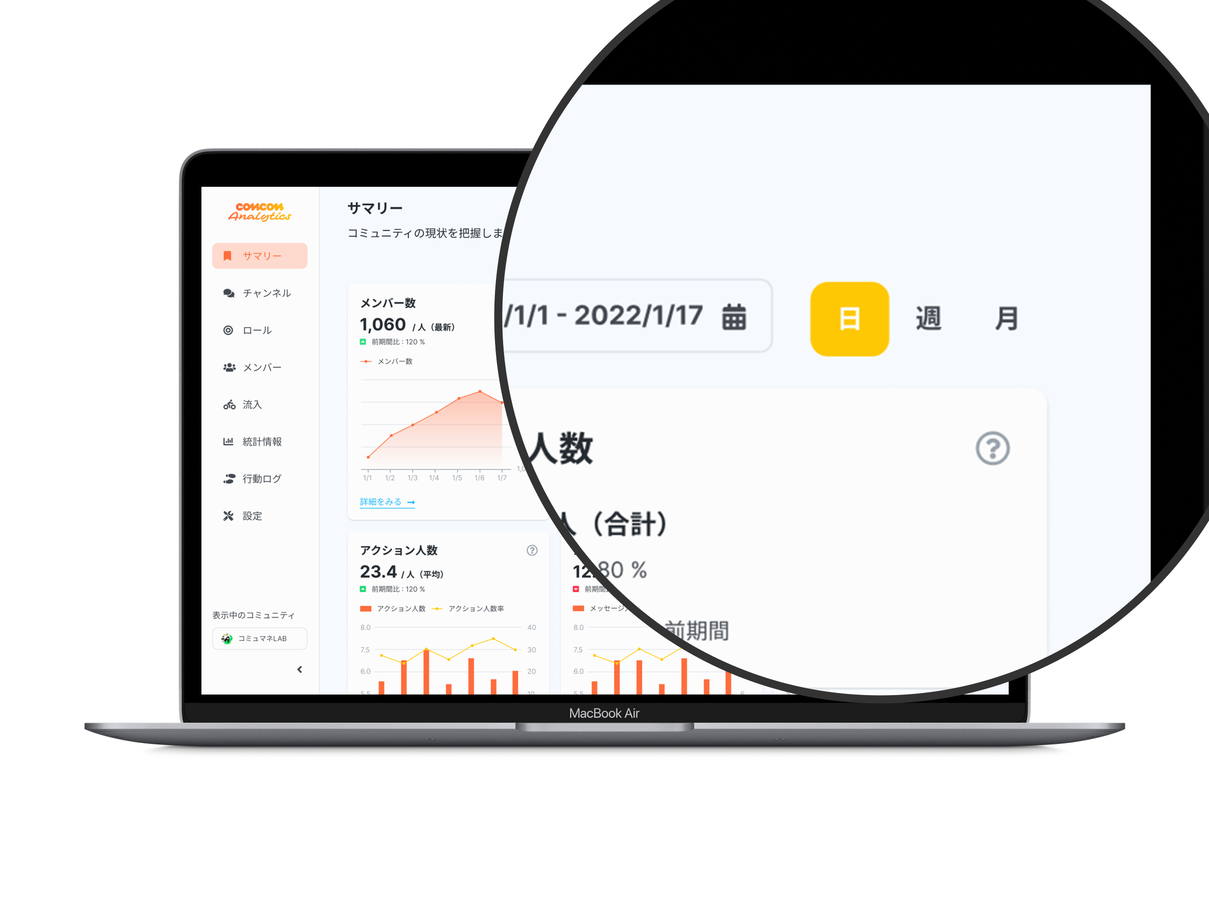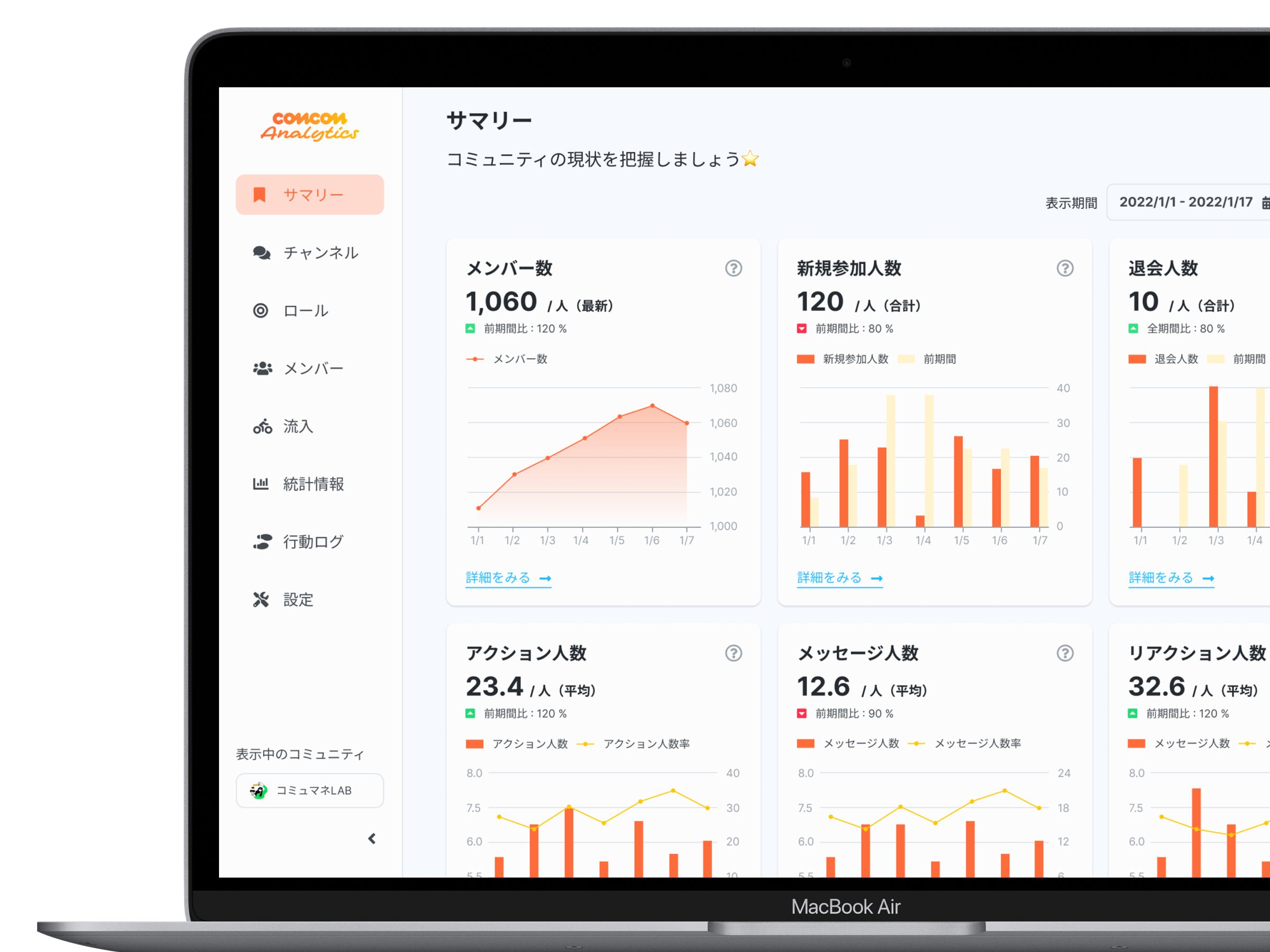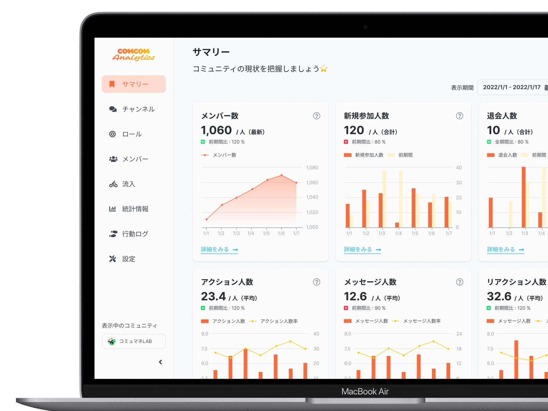 comcom analytics は、Discord または Slack 上で運営されているコミュニティを分析・モニタリングできるダッシュボードです。Bot を導入するだけの1ステップで、コミュニティの健康状態や前後比較ができるようになります。