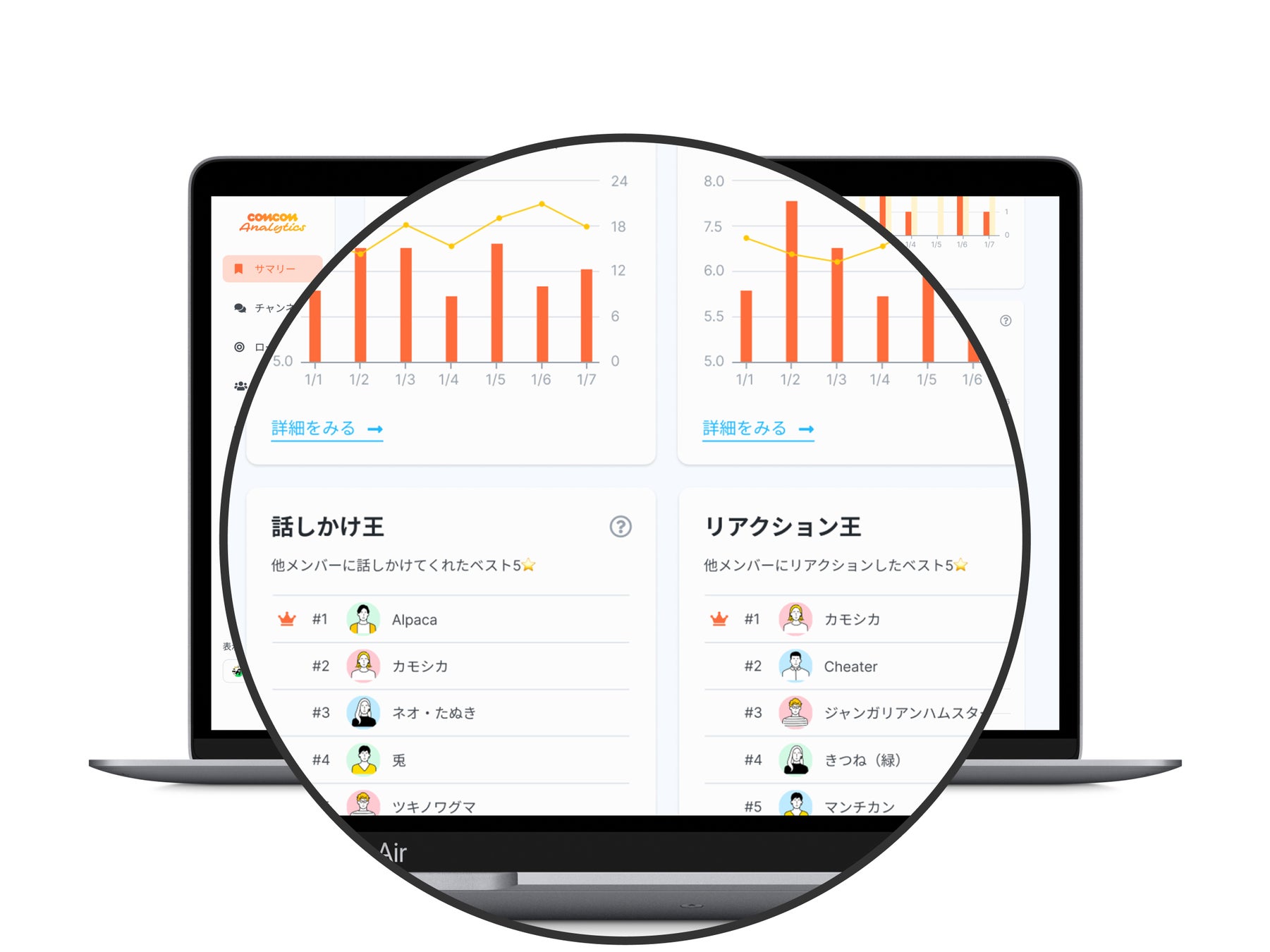 comcom analyticsは、統計情報を活用することで、コミュニティマネージャーの業務負荷を軽減することを目指しています。目立ちにくいメンバーの行動や過去投稿へのリアクションなど、これまで四六時中コミュニティの動向を観察する必要があった情報を表示することで、意思決定コストの低下や貢献者に「適正」な評価をすることが可能になります。