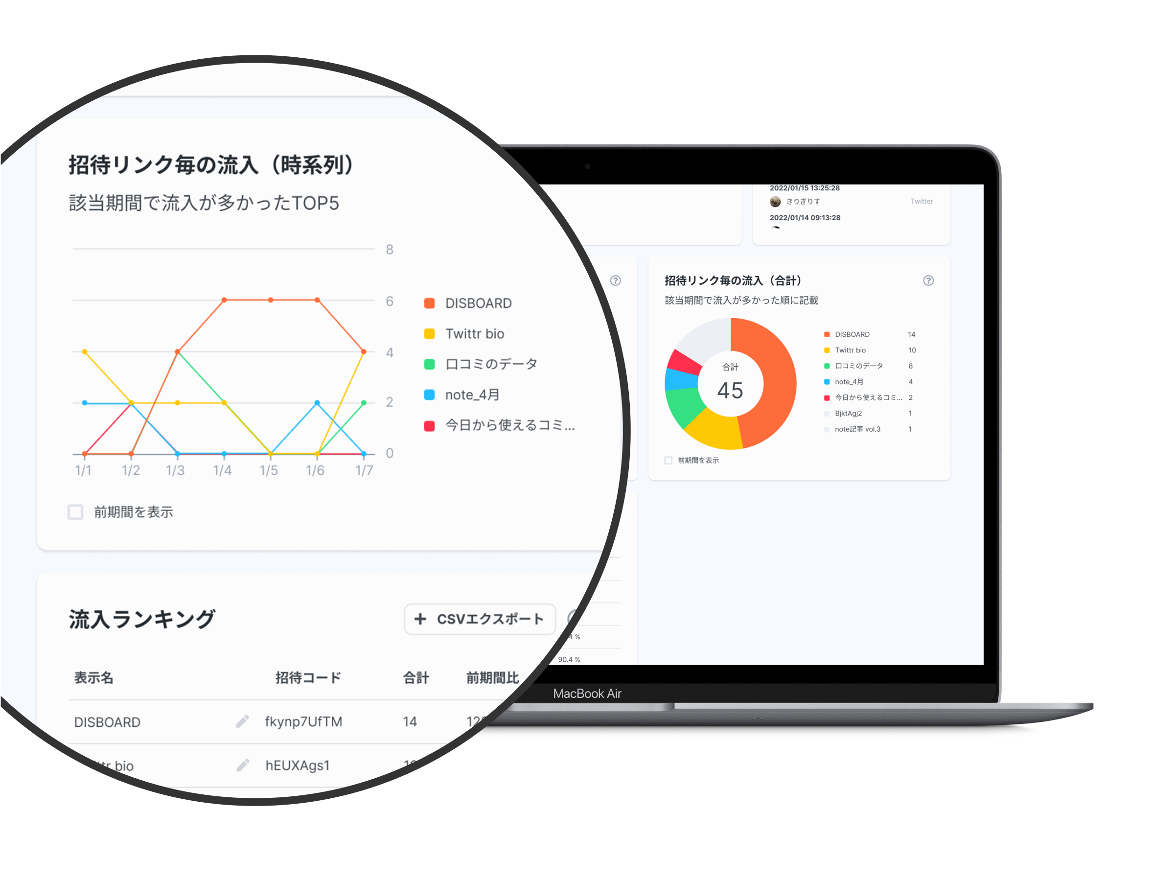 招待リンク毎に「いつ・何人・誰が」コミュニティに参加したのかをモニタリングすることができます。招待リンクに名前をつけることができるので、WebサイトやTwitter、あるいはメンバー紹介などの効果を測定することが可能です。将来的には、経路別のアクティブ率などを表示することも検討しています。