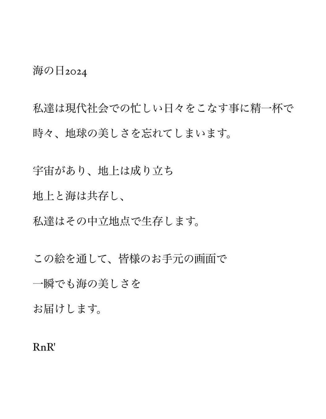 7月15日は海の日。この日を迎えるにあたって、豊かで美しい海をテーマとしたパワー溢れるRnR’のアート作品をお届けいたします。