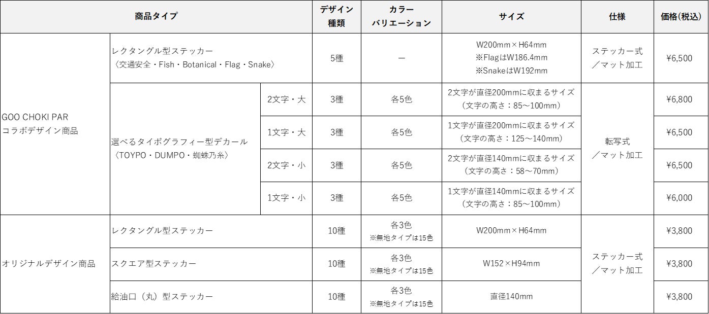 また、「GOO CHOKI PAR」デザインの他にも、沢山の方の幅広い“自分らしさ”に応えられるオリジナルステッカー商品を全10種類×各3~15色、価格は3,800円~用意されています。
