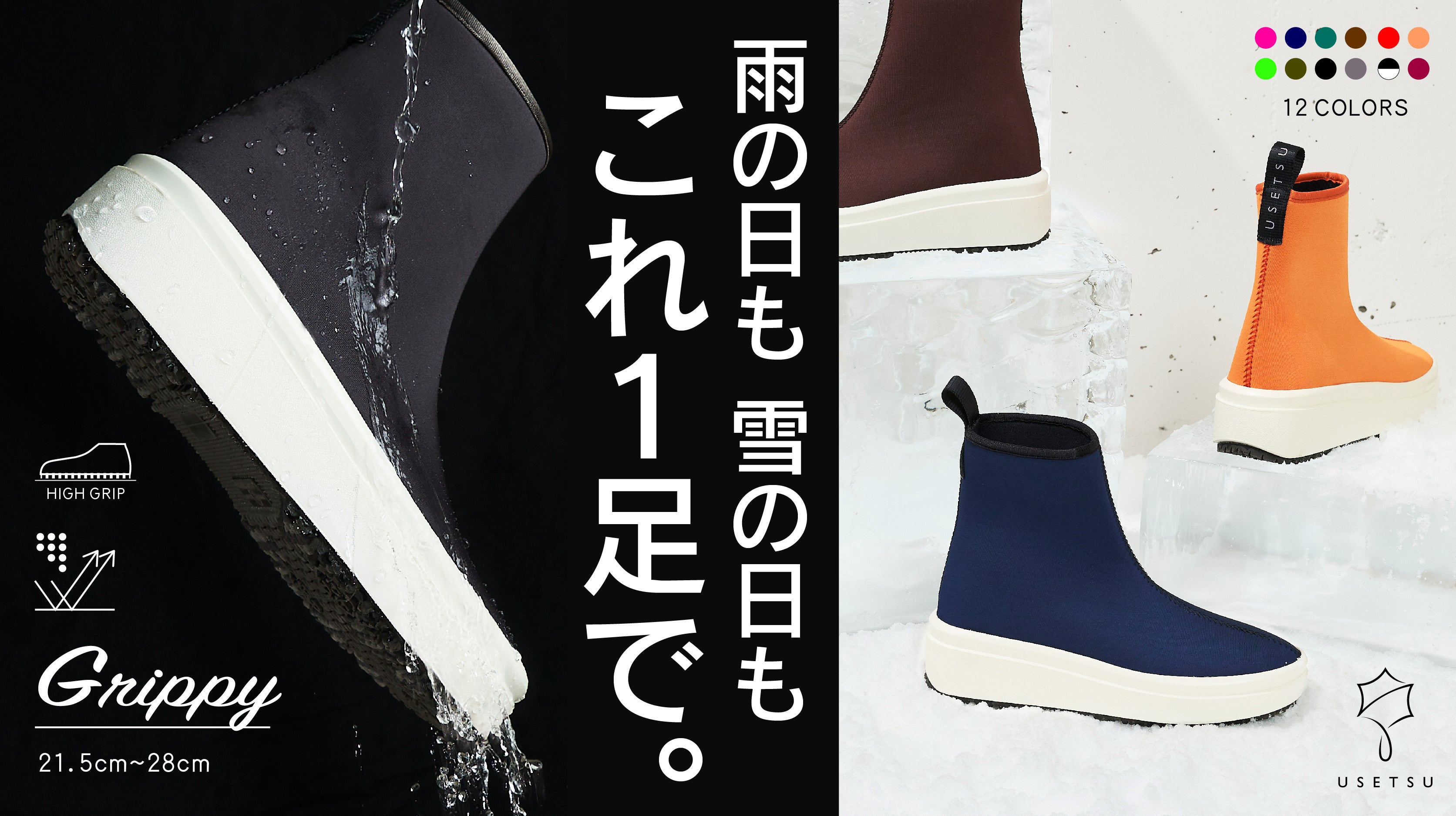 今回makuakeさんで販売開始したGrippyは【防滑】【防水】【保温】の3つの機能を搭載した、雨、雪、日常使いにもぴったりなオールインワンシューズです。