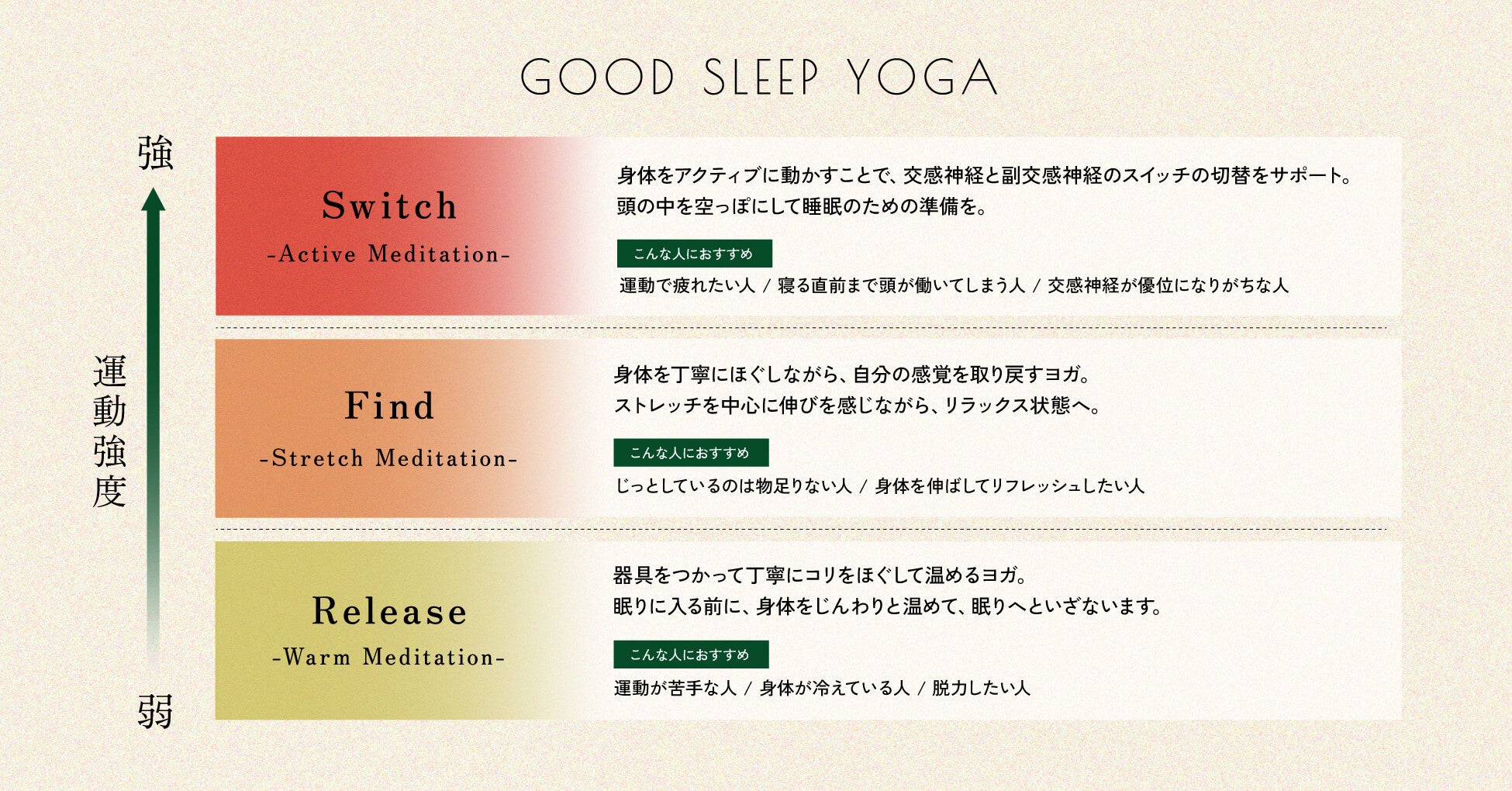 本プログラムでは、動きの強度が異なる3つのメニューをご用意しました。寝る直前まで頭が働いてしまいがちな人におすすめの「SWICH〜Active Meditation」では、最もアクティブな動きを行い身体を動かすことに集中し、頭をからっぽに。眠りのための準備をできる身体を整えます。身体を伸びを感じてリフレッシュしたい人におすすめの「FIND〜Stretch Meditation〜」ではストレッチポーズを中心に身体を温めて心地よく身体を動かします。体が冷えがちな人におすすめな「RELEASE〜Warm Meditation〜」では器具を使って自分の疲れているポイントのコリをほぐし、身体を動かしやすくします。の3つの中から、その日の気分や体調に合わせて実施していただけるプログラムになっています。