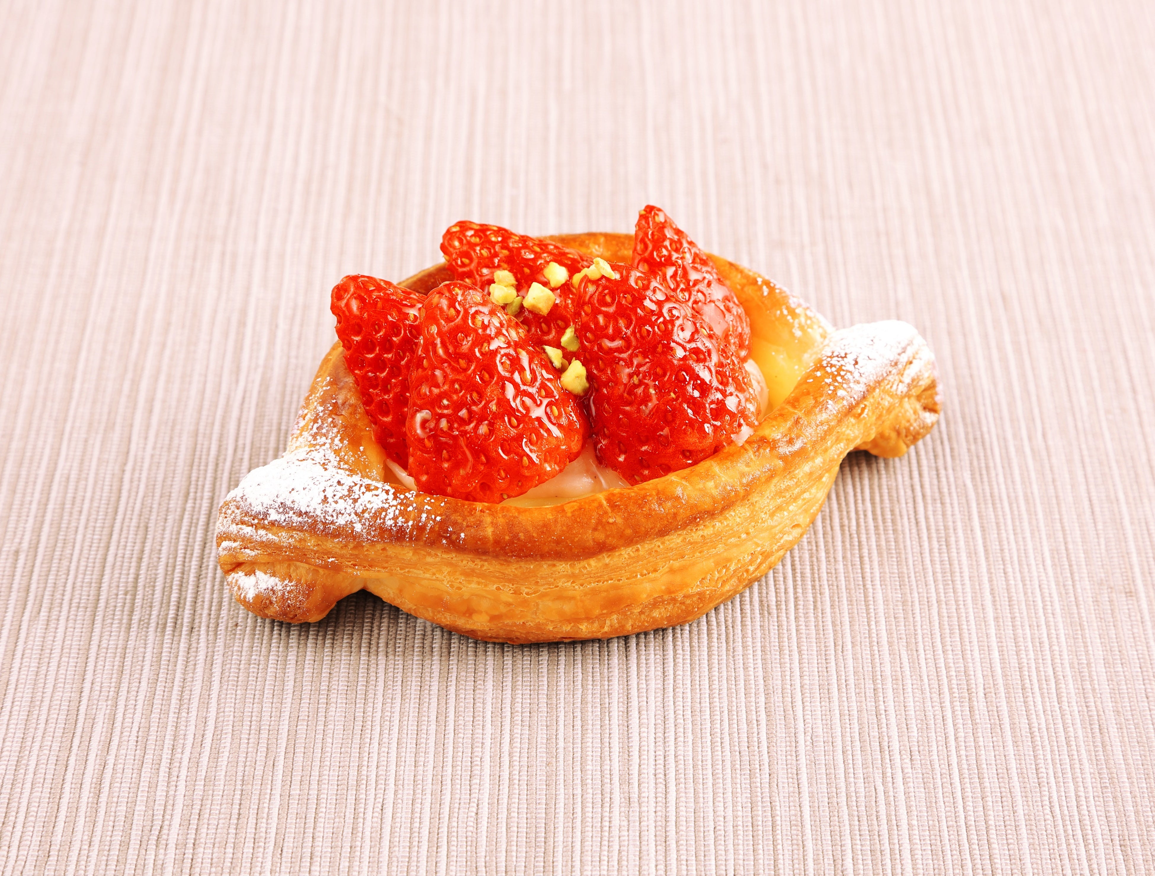 サクサクの生地にカスタードクリーム・いちごクリームを合わせ、フレッシュないちごをトッピング。アクセントにピスタチオダイスを振りかけ、見た目も可愛いデニッシュに仕上げました。
