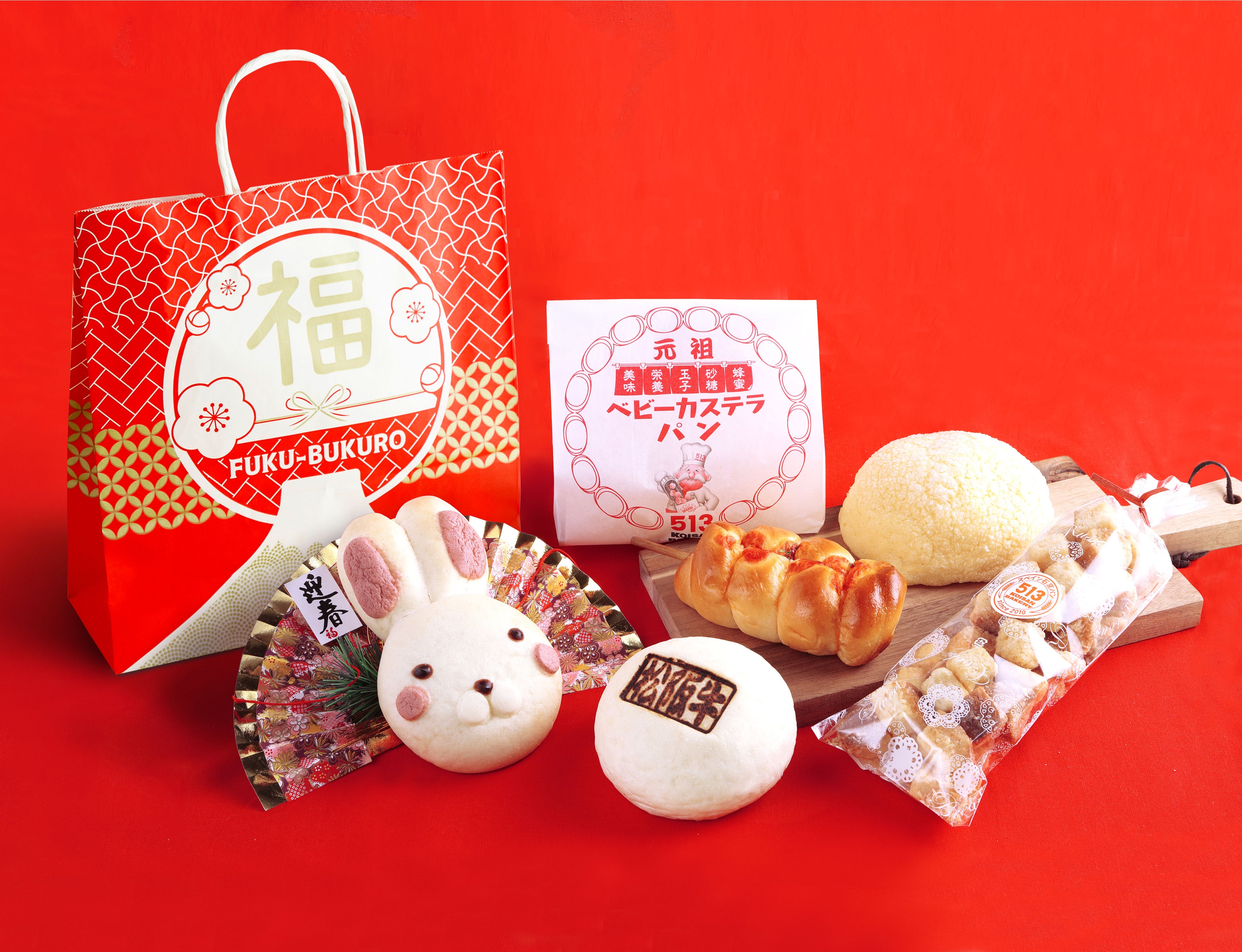 毎年大人気の513BAKERYのパン福袋!2023年も【513新春パン福袋】と【高級食パン福袋~スペシャルハッピーバッグ~】の2種類を販売いたします。【513新春パン福袋】は、1,700円相当のパンが入って、なんと1袋 税込1,000円!!干支の「うさぎ」の形をしたかわいいクリームパンや自家製の松阪牛を半熟風たまごと包んだ「松阪牛すき焼きパン」が入ったお得な福袋になっています。また、【高級食パン福袋~スペシャルハッピーバッグ~】は、3,300円相当のパンが入って、なんと1袋 税込2,000円!!メロンパンやクリームパンなどの人気のパンのほかに、513BAKERY自慢の高級食パン「そのまんま食パン」や北海道産の無添加バターを使用した高級バタージャムが入り、さらに「513(コイサン)円金券」もついてくるとっても豪華な福袋になっています。