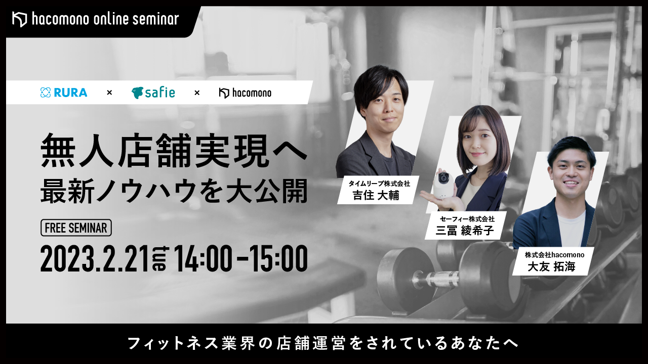 【RURA×Safie×hacomono】フィットネスにおける無人店舗実現の最新ノウハウを紹介するセミナーを開催