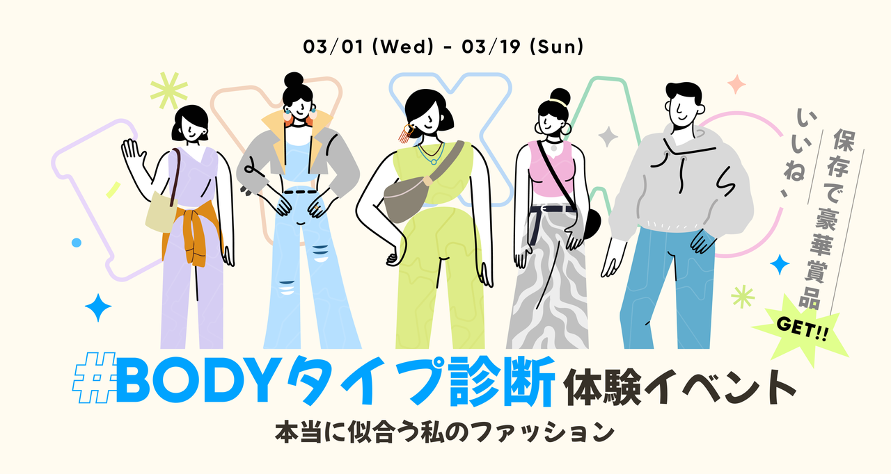 「BODYタイプ診断」のリリースを記念して体験イベントを開催します。「#BODYタイプ診断」&ご自身のBODYタイプのハッシュタグをつけて、タイプ別のファッションコーデやテクニックを投稿しましょう!
