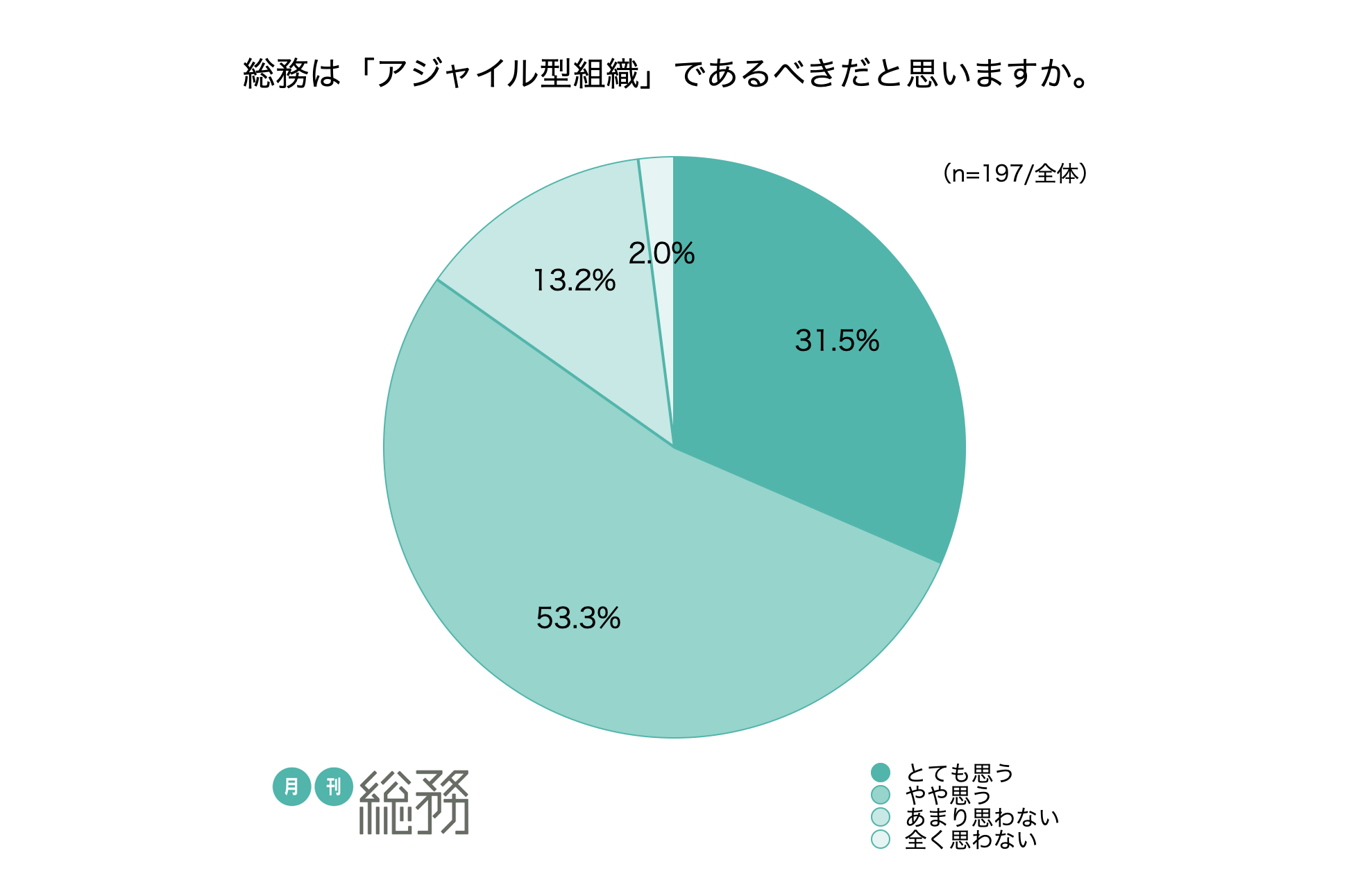 総務は「アジャイル型組織」であるべきだと思うか尋ねたところ、「とても思う」と「やや思う」は合わせて84.8%という結果になりました(n=197)。