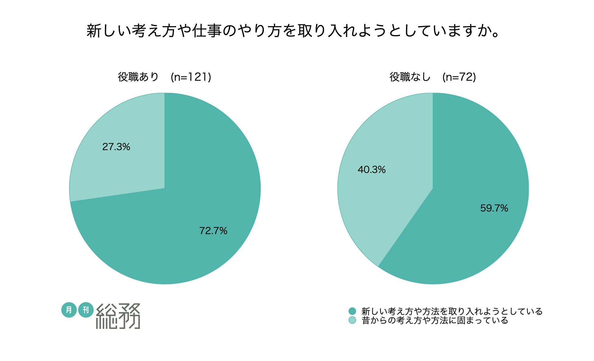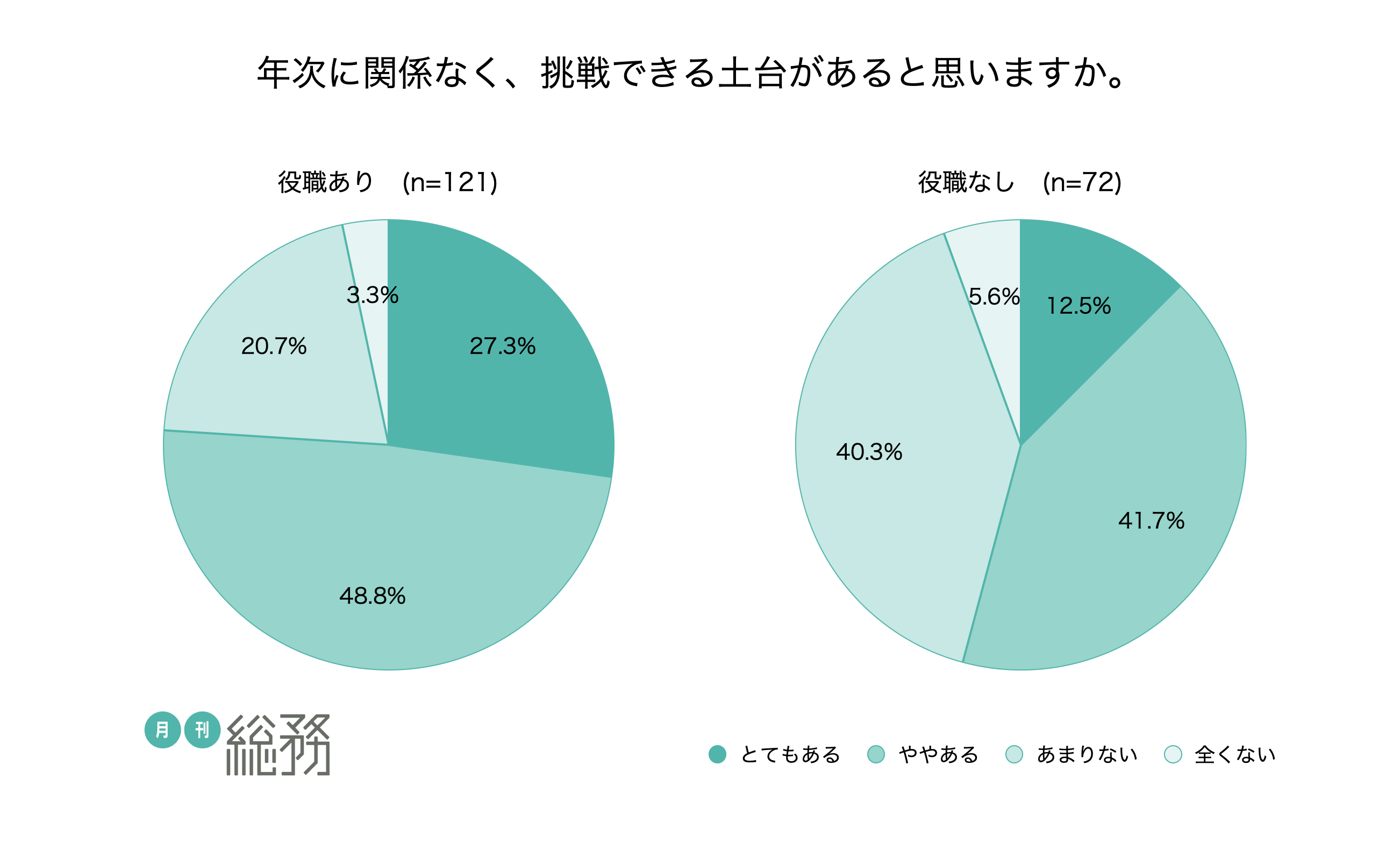 - 年次に関係なく挑戦できる土台がある総務組織は約7割。役職の有無で21.9ポイント差