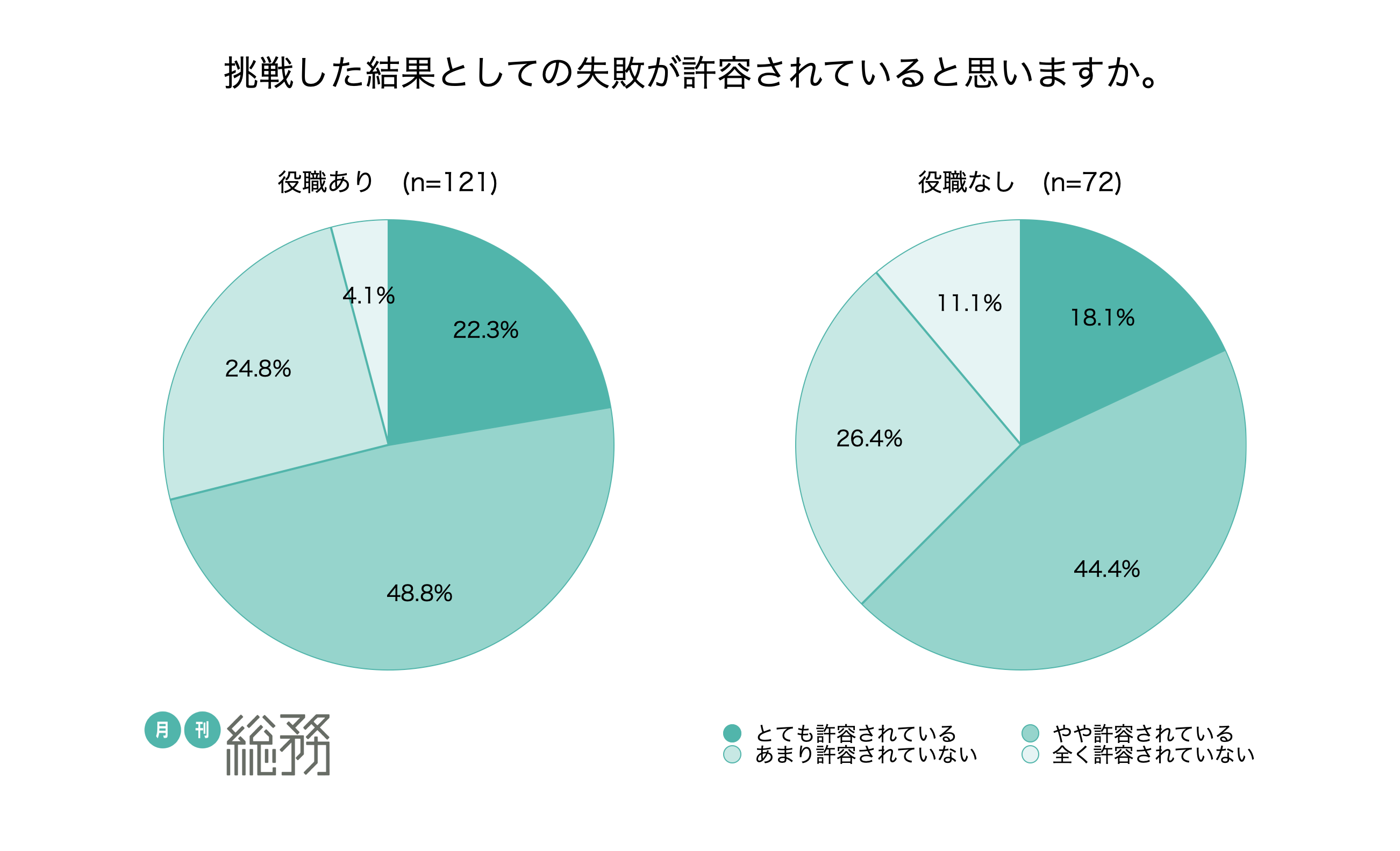 - 挑戦した結果として失敗が許容されている総務組織は約7割
