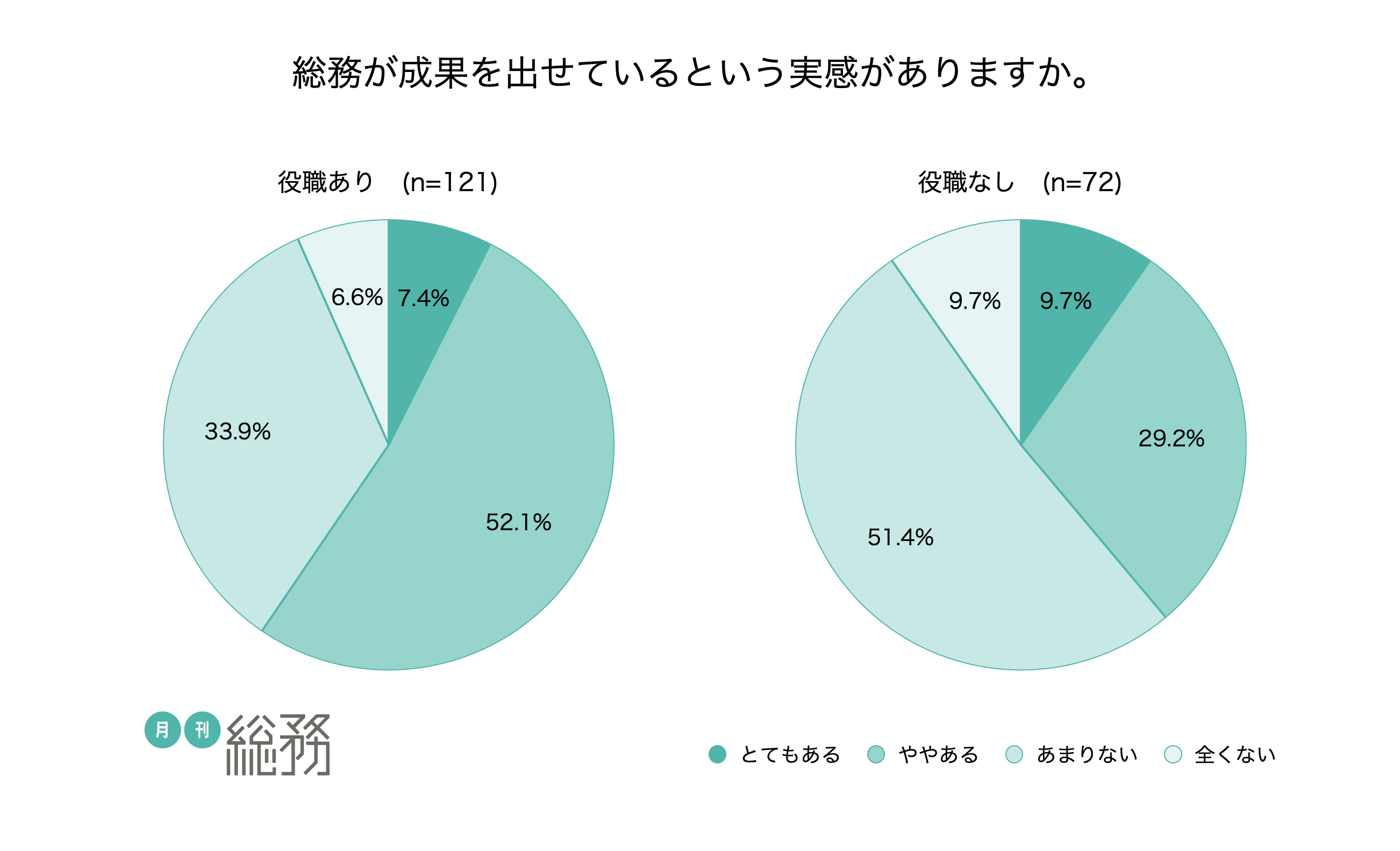 - 総務が成果を出せている実感があるのは約半数。役職の有無で実感に20.6ポイント差