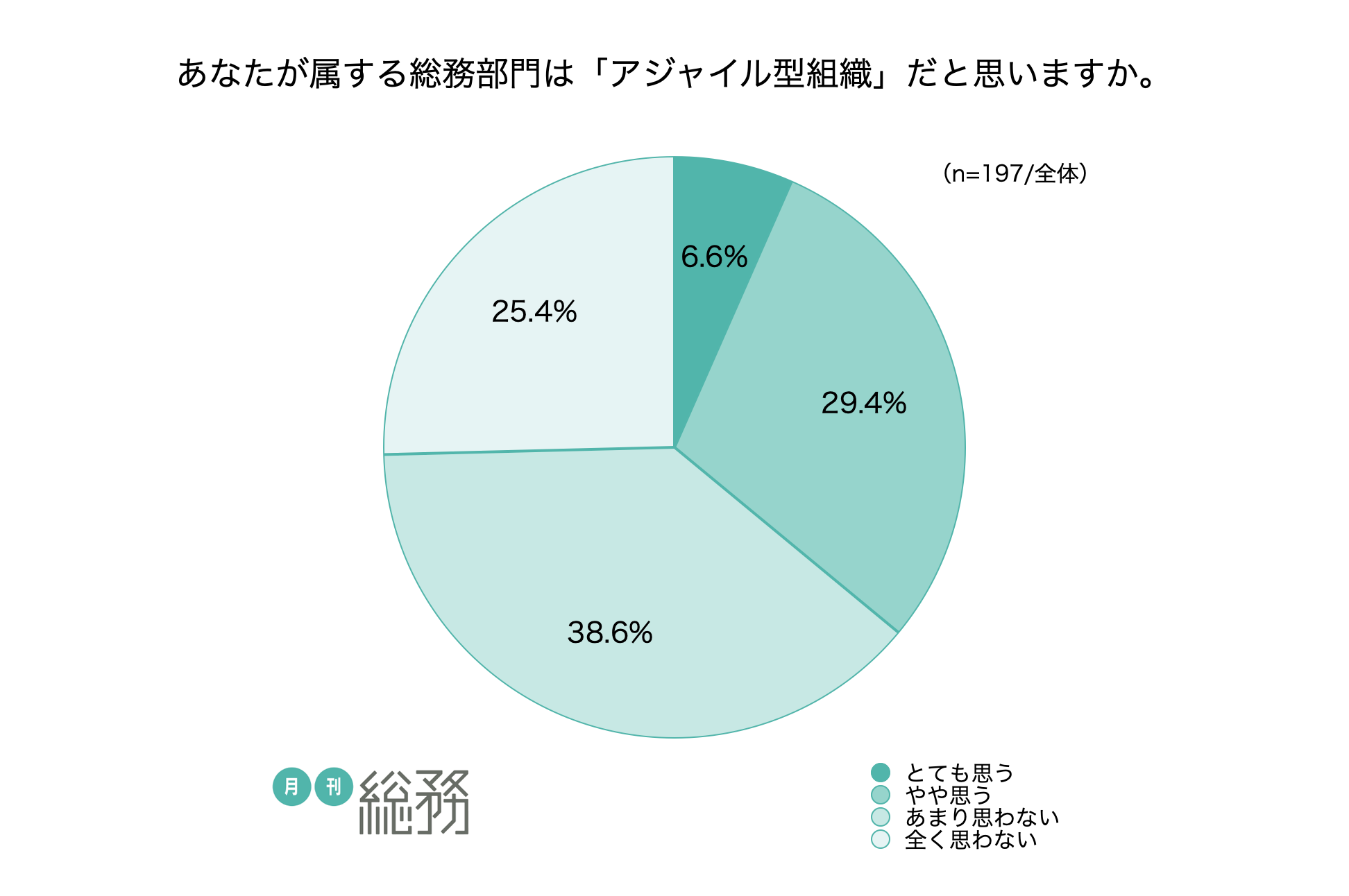 日本で唯一の総務専門誌『月刊総務』を発行する株式会社月刊総務(所在地:東京都千代田区、代表取締役:豊田健一)は、全国の総務担当者を対象に「総務の組織の在り方(アジャイル型組織)についての調査」を実施し、197名から回答を得ました。