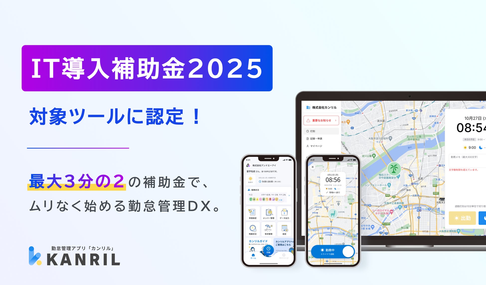 モバイルアプリ及びAIサービスの開発を行う株式会社アンドエーアイ(本社:東京都港区、代表取締役社長:西 真央、以下:当社)が提供するクラウド型勤怠管理システム「カンリル」は、このたび経済産業省が実施する「IT導入補助金2025(以下、IT導入補助金)」の支援対象ITツールとして認定されました。これにより、「まるなげコース」の初期導入費用および2年間の利用料金について、最大最大3分の2の補助を受けることが可能となります。