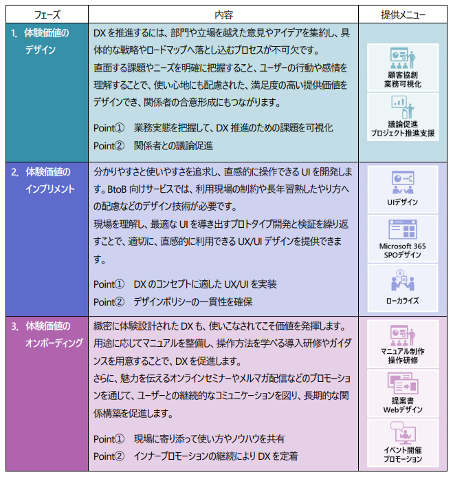 ■ DX推進プロセスにおける一貫したユーザー体験(UX)価値を高める3つのフェーズ