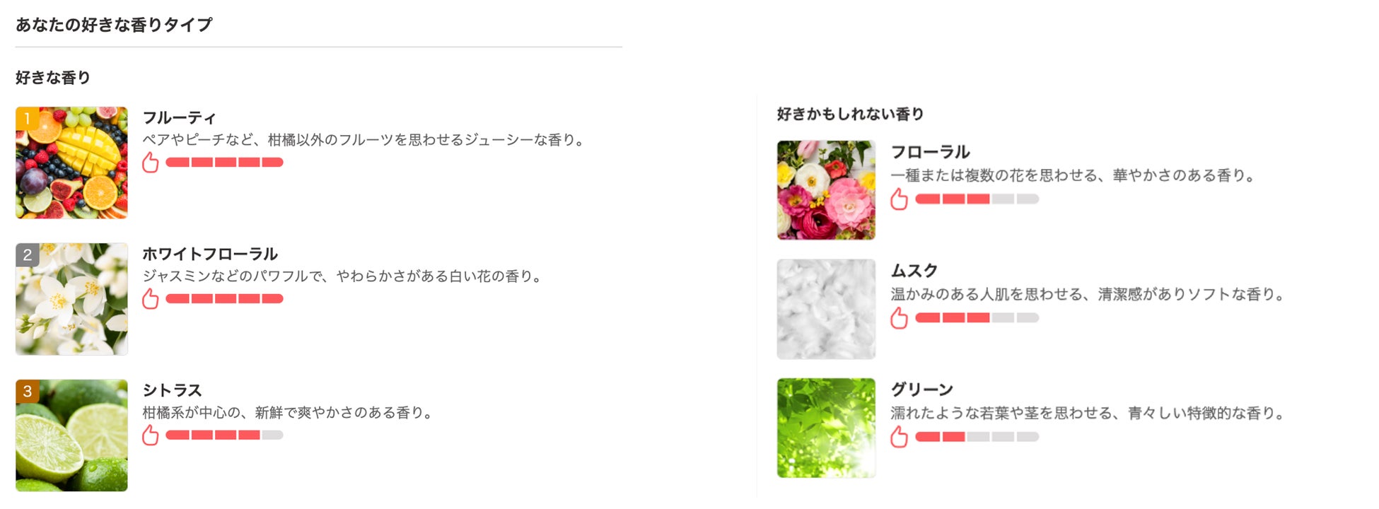 フレグランスプロフィールとは、お客様による香りの評価(商品レビュー)をもとに、好きな香りタイプやノートを分析してご紹介する機能です。香水選びにおいては、「香りの好みはなんとなく分かっていても、それを言語化することが難しく、自分に合った香りを探すことが難しい」という課題を持つお客様が多くいらっしゃるため、商品レビューをもとにおすすめの香りが分かる機能を設けています。この度、さらなる香りの好み度の正確性向上や香水選びにおける悩み解決、オンライン上で香りのプロにカウンセリングされているような体験の提供を目的とし、以下の点についてリニューアルを行いました。