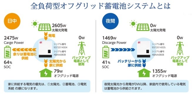 オフグリッド蓄電池システムとは、電力会社の送電網への逆潮流(Reverse Current)を行わない電力システムであり、昼間発電した電気を売電せずに家庭で使用しながら同時に蓄電池に溜めます。そして夜間に溜めた電気を使用することで、電力会社から電気を購入することなく自給自足が可能になります。電力会社の買取価格は年々下降しており、近年多発している大規模自然災害への備えにも対応するため、停電時出力が6.0kVAと消費電力の高い機器を含む多くの家電機器の使用可能と、一般家庭における「光熱費0円住宅」を目指します。