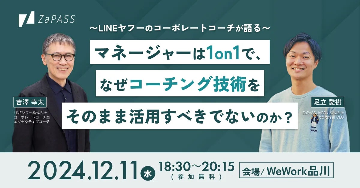 今回のリリースに合わせて、LINEヤフー株式会社 コーポレートコーチ室 エグゼクティブコーチで『1on1ミーティング「対話の質」が組織の強さを決める』の共著者でもある吉澤 幸太様をゲストにお招きし、無料セミナー「〜LINEヤフーのコーポレートコーチが語る〜 マネージャーは1on1で、なぜコーチング技術をそのまま活用すべきでないのか?」を12月11日(水)にWeWork 品川にて開催いたします。