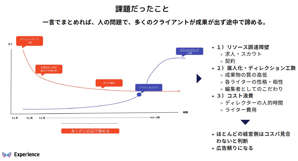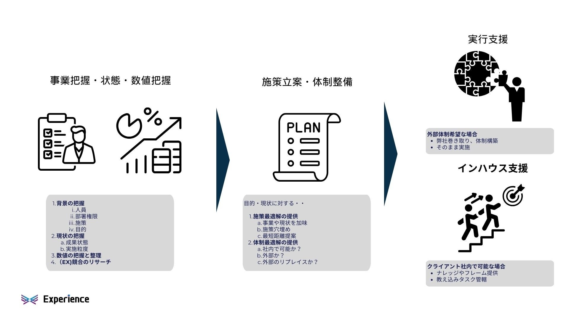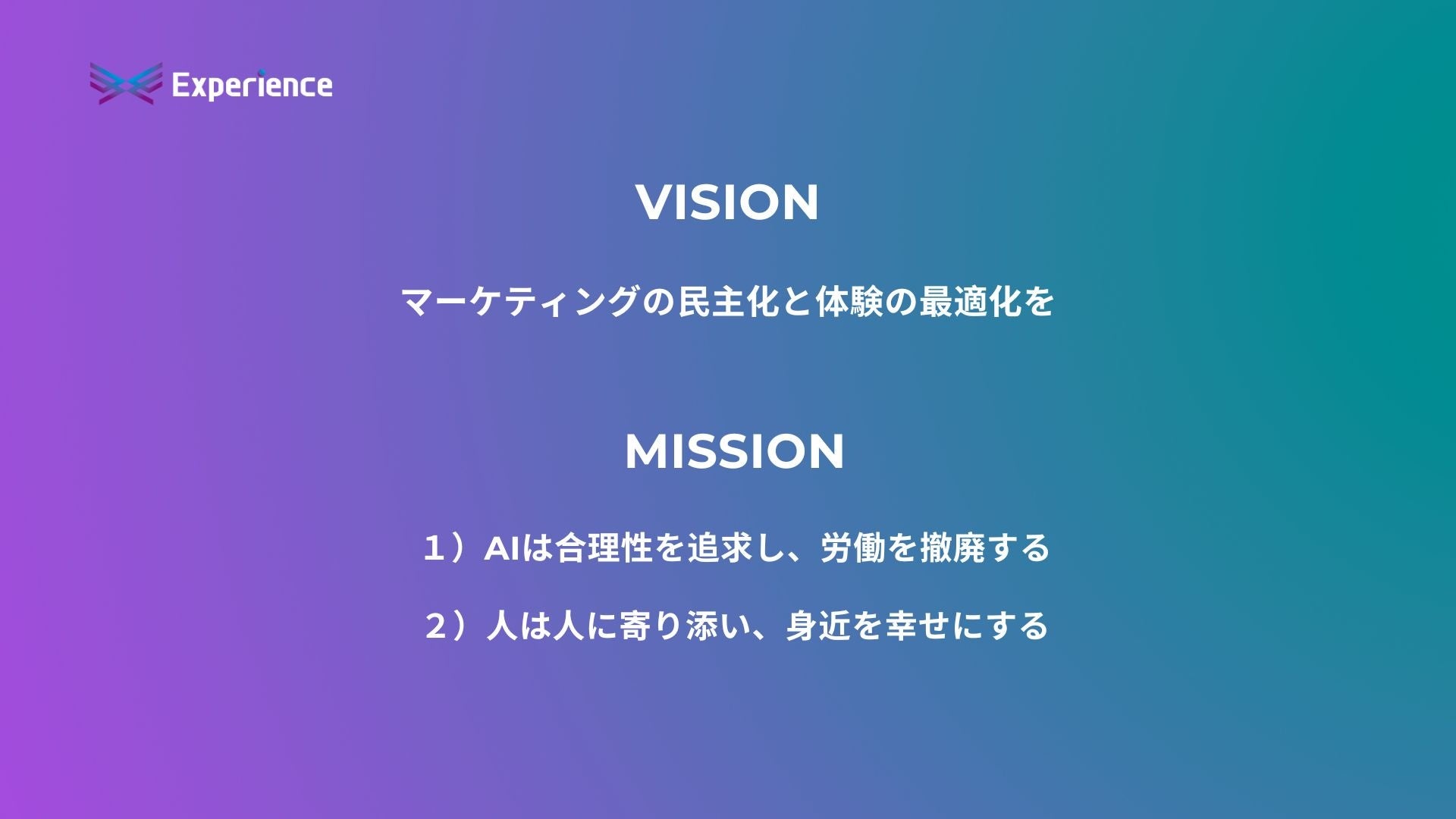 マーケティング施策における顧客体験およびクライアントの体験を最適化させたく、Experienceと命名しました。合理的部分は人間よりも遥かに勝るAIを積極的に活用することを大事にしています。一方で人間の「やりたい」には、どこまでも人的支援で付き添うことを信念としている会社です。