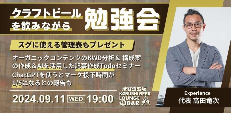 株式会社 Experience(東京都目黒区 代表取締役 高田竜次 以後、当社)は、2024年9月11日にKOBUSHI MARKETING様との共催セミナーを実施いたしました。テーマは生成AI(主にChatGPTを用い)、KWD分析からその後の一連のアウトプットまでの流れです。