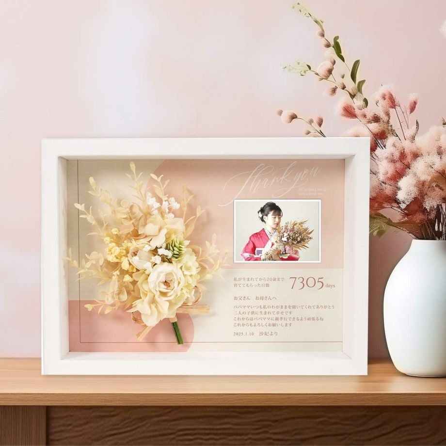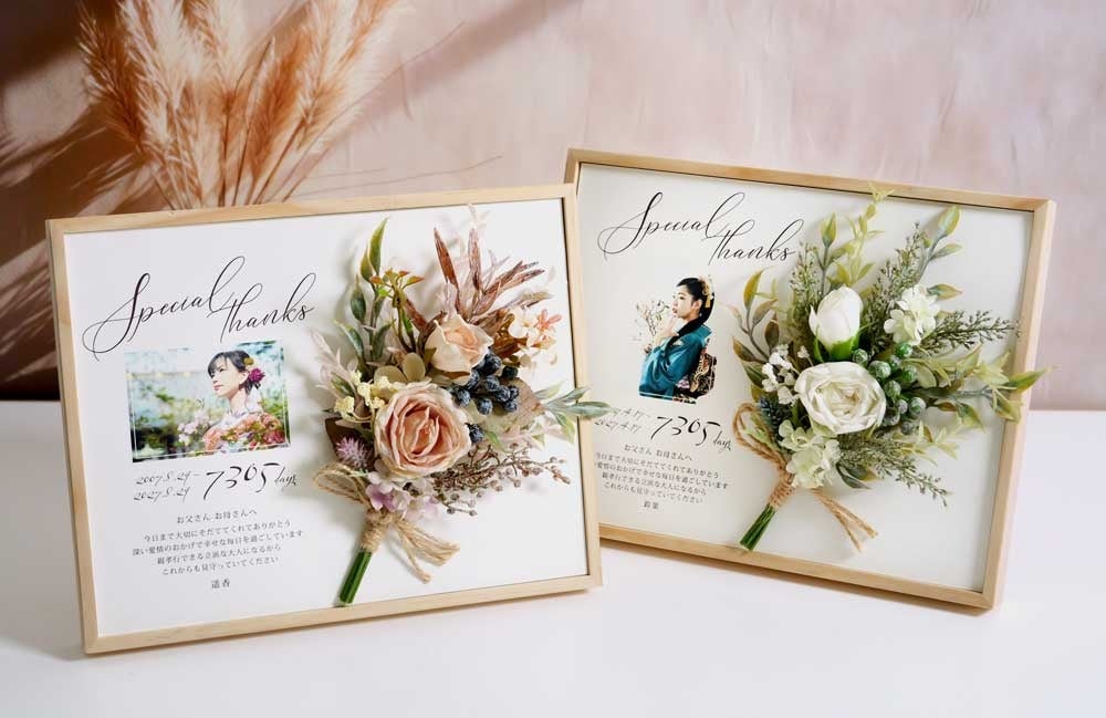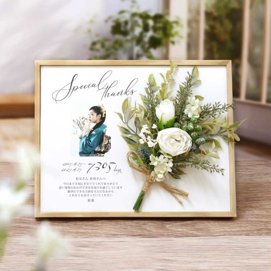 トレンドに敏感な新成人とその親御さんにも満足いただける、花束と子育て感謝状がひとつになったような華やかなギフトアイテムです。