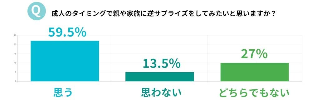 最近では20才や成人まで育ててくれたご両親への感謝を伝えようと、子から親へ贈る逆サプライズギフト《成人式親ギフト》の需要が増えています。このギフトは《♯逆プレゼント》とも言い、今回実施したアンケートの結果(下記参照)から見ても、今後新成人の間で定番になっていく演出となることが予測されます。