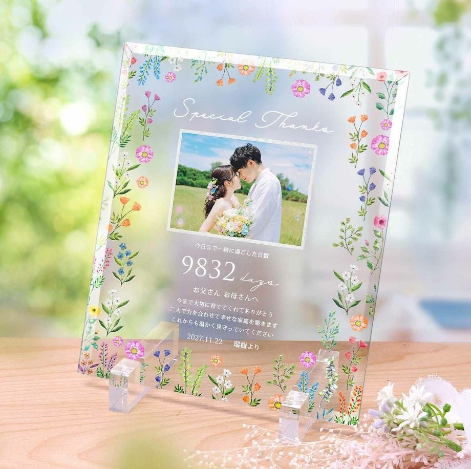 ガラスにUV印刷を施し、斜めにカットされたダイヤカット仕様で高級感と重厚感のある感動の子育て感謝状にしあげました。デザインは全部で5種類、写真あり/なしもお選びいただけます。