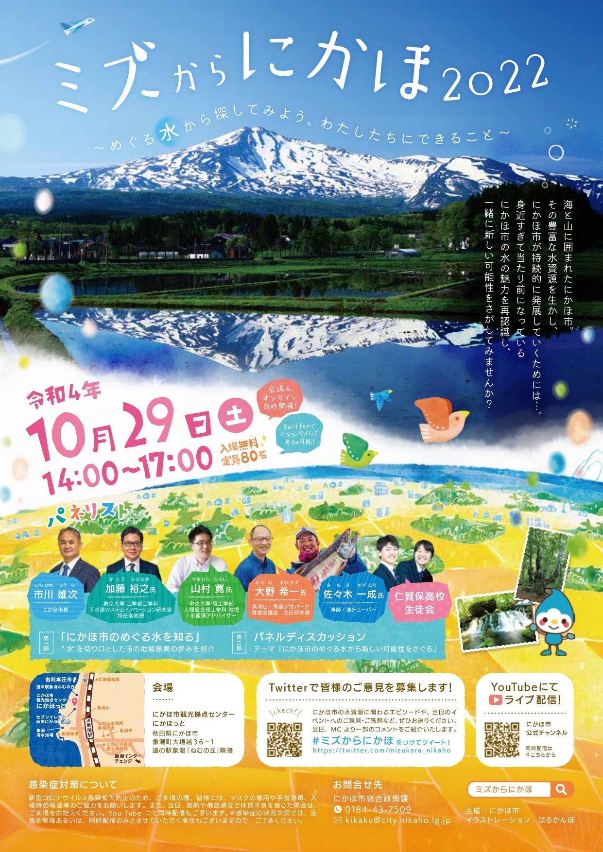 にかほ市が、普段当たり前となっている水資源の魅力を改めて市民と共有するイベント「ミズからにかほ2022~めぐる水から探してみよう、わたしたちにできること~」を対面&オンラインでハイブリット開催