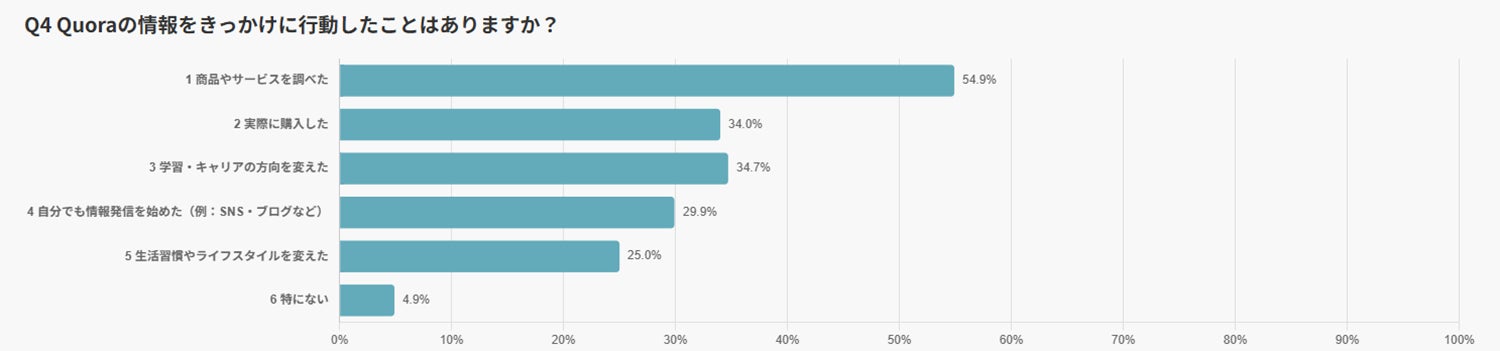 Quoraの情報をきっかけに何らかの行動を起こした日本人ユーザーは多く、単なる閲覧プラットフォームにとどまらない影響力が見られました。