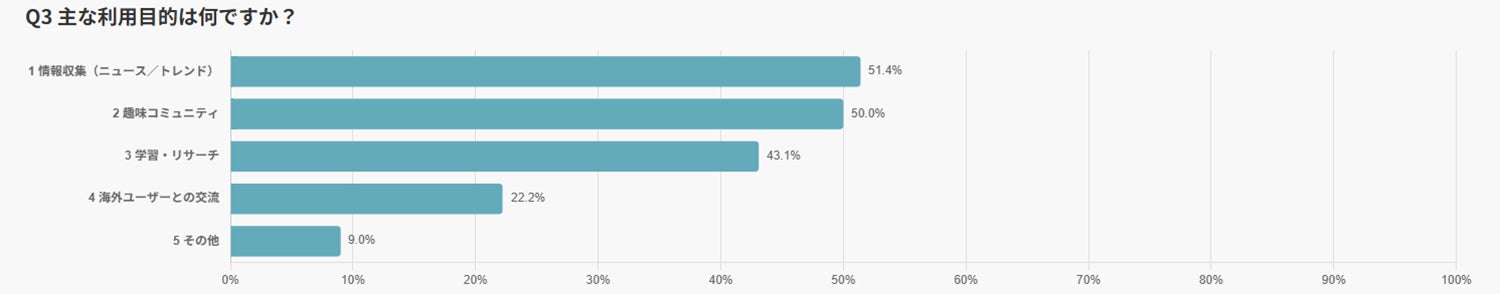 一方で、「海外ユーザーとの交流」と回答した人は22.2%にとどまり、英語圏を中心とするQuoraの国際性を意識しつつも、日本人ユーザーの多くはまず国内的な情報収集や興味関心の共有を目的として利用していることがうかがえます。