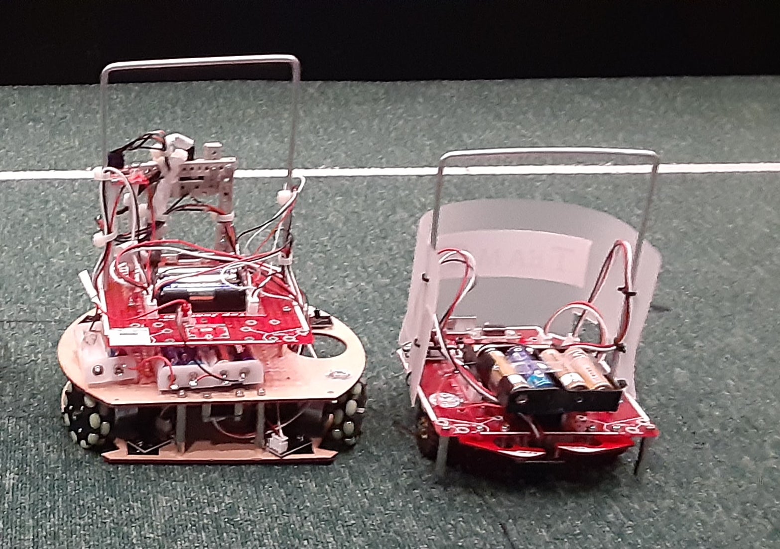 ロボカップライトウェイトに参加するチームSTです。昨年度はチームキャプテンが京阪奈全国大会に出場した実績のある2人で組んでいます。この支援を受け、C言語というプログラムで、自律し自由自在に動くロボットの作成を目指します。