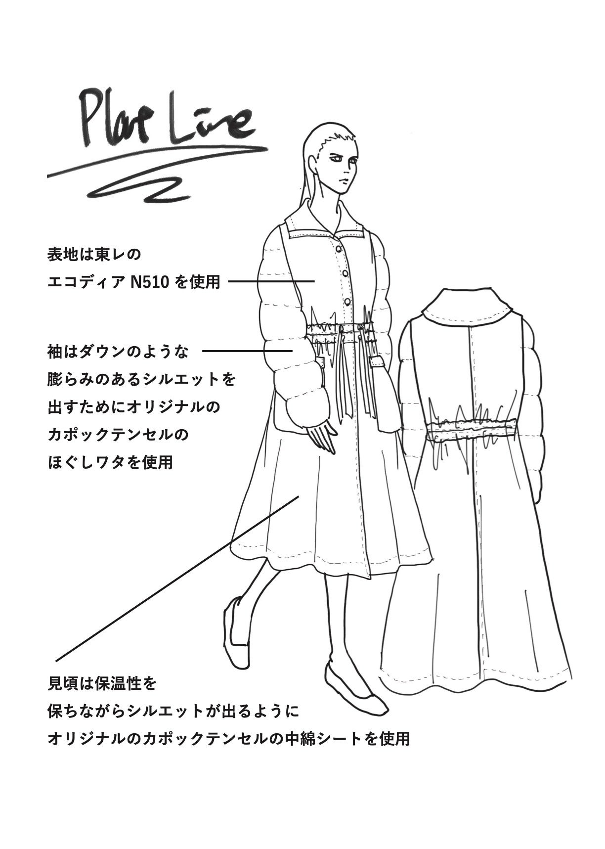 ダウンの特徴である「モコモコとした袖」を再現すべく、カポック100%のほぐしワタを手詰めすることで、本来のダウンと変わりないシルエットを再現。また、表面生地には東レ株式会社開発の100%植物由来ナイロン素材『エコディア®️N510』を使用した極薄生地で軽量性を確保しました。スタンダードなスタンドカラーのダウンをベースに襟を大きくしたり、ウエストスピンドルでシルエットが遊べるようにしたり、裾をサーキュラーの形にしてドレスの要素も溶け込むようにデザインしています。